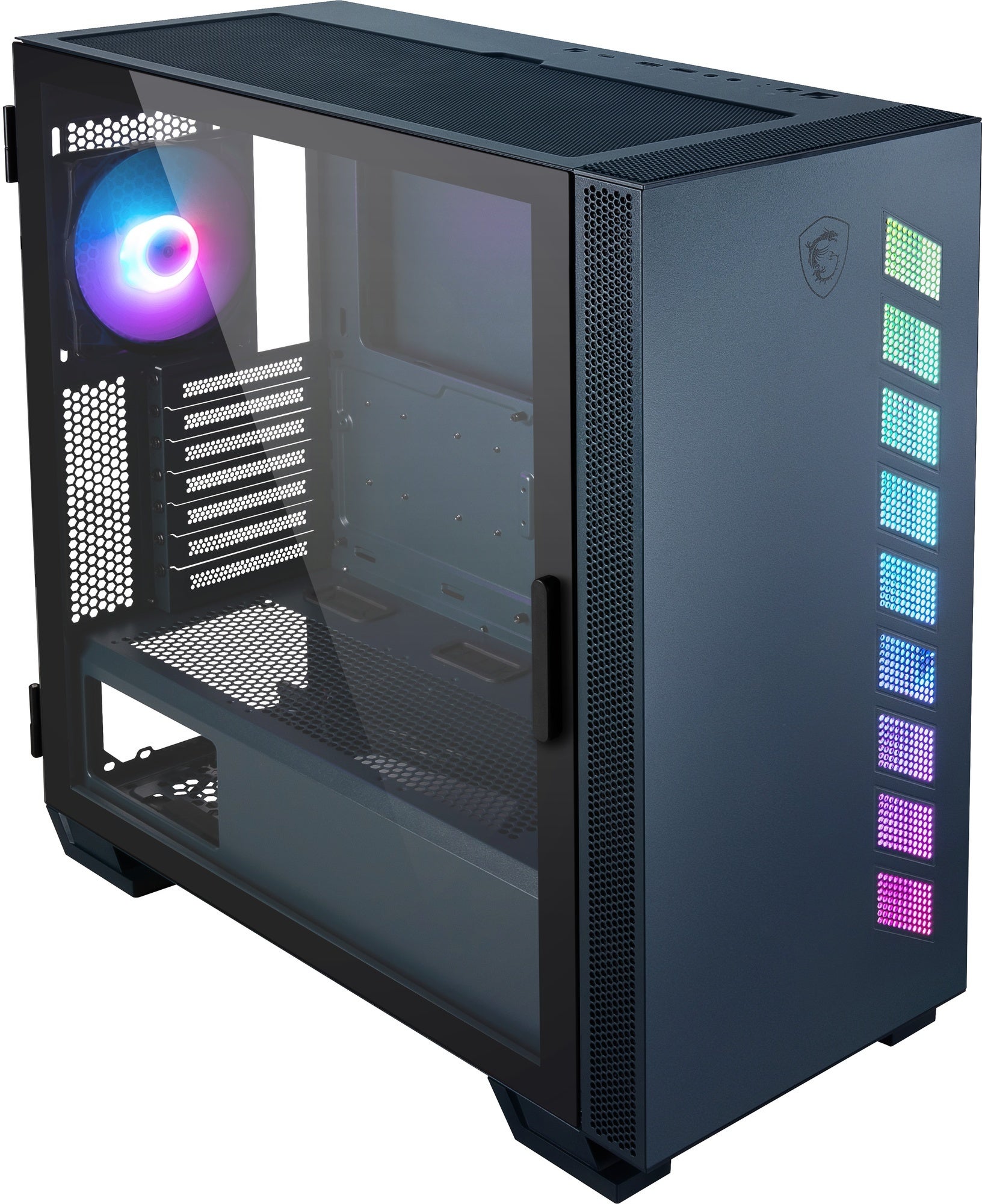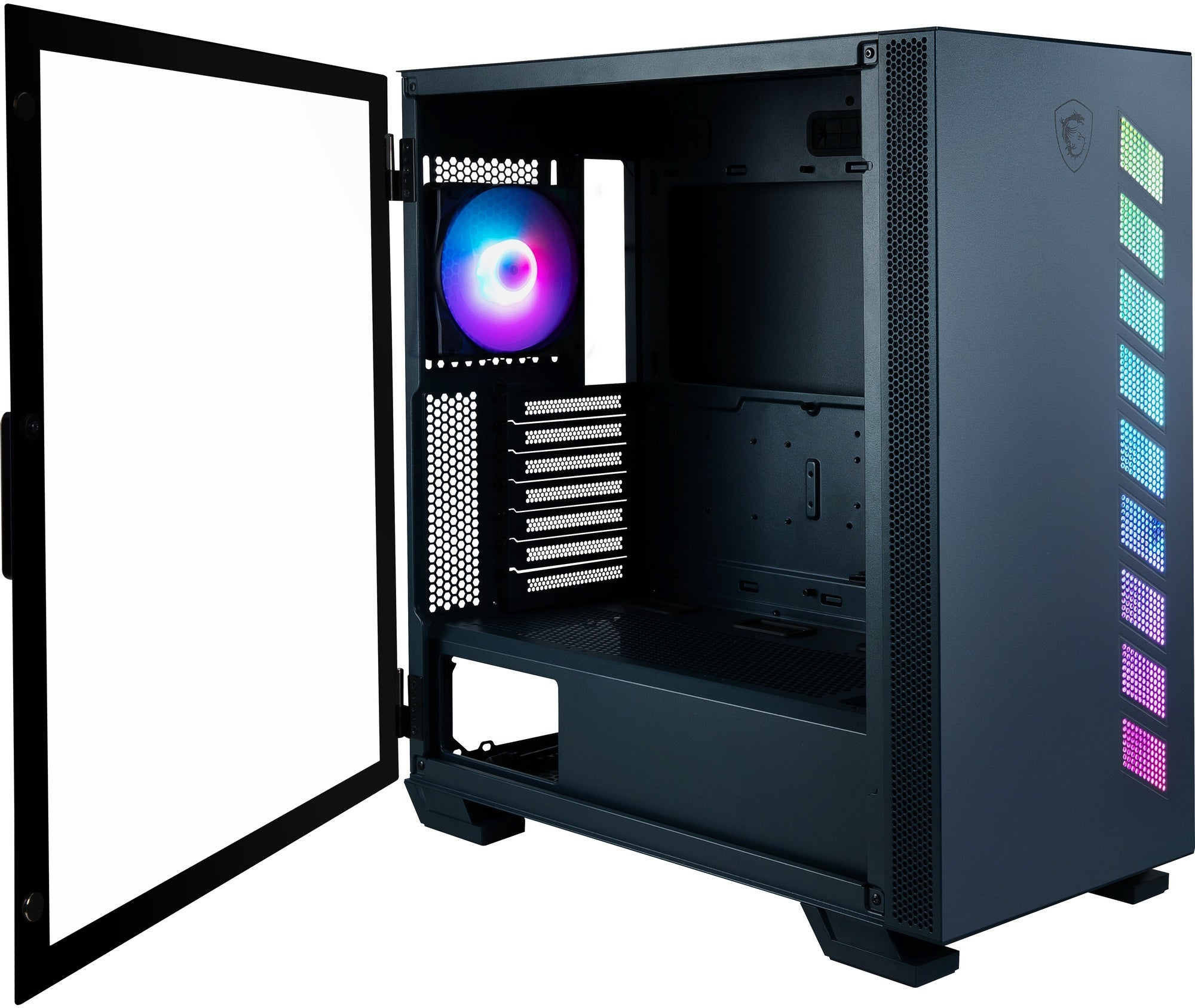 強化ガラスを採用した、ヒンジ構造のサイドパネルを搭載。「Mystic Light」に対応するRGB LEDストリップを備えており、印象的なフロントパネルに仕上げています。