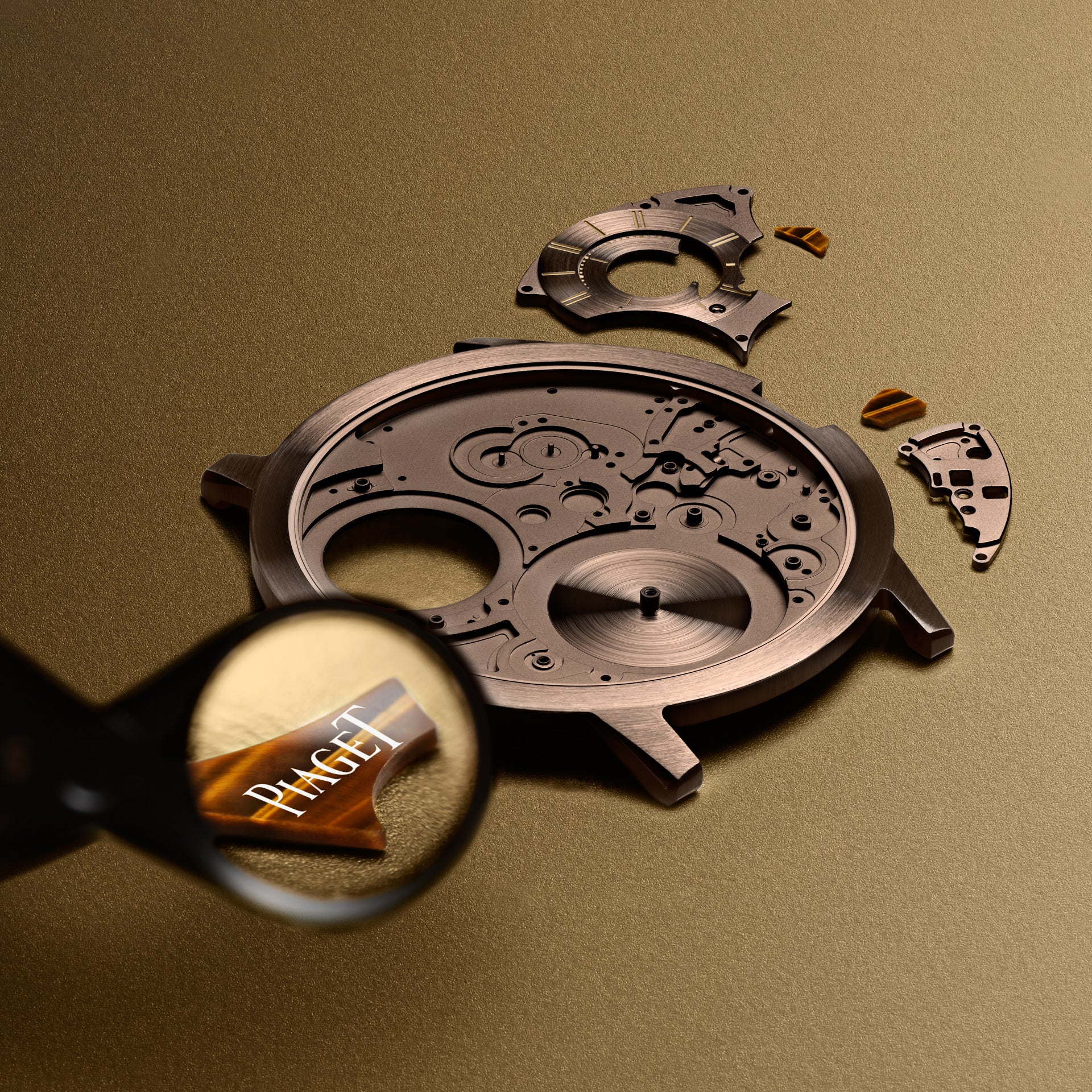 ストーンはムーブメントに組み込まれた部品に取り付けられるため、ストーンに損傷を与えることなく残留物を除去する洗浄工程が必要になります。0.15mmの針(ピアジェが使用する最細針)を使用して行う作業であり、非常に慎重な取り扱いと細心の注意を払った入念な組み立てを必要とします。ピンクゴールドをあしらった、豊かでまろやかなブラウンモデルには、ハニーカラーのタイガーズアイが組み込まれており、1960年代のスタイルセレクターを再現したメゾンは、4色から選べるケースと、タイガーズアイ、ブルーソーダライト、翡翠、オニキスの4種類のオーナメンタルストーン、およびその他のパーソナライズされたディテールも提供しています。ピアジェが誇る2026年の豊かなオーナメンタルストーンの伝統にふさわしい、胸躍る大胆なフィナーレを飾ります。