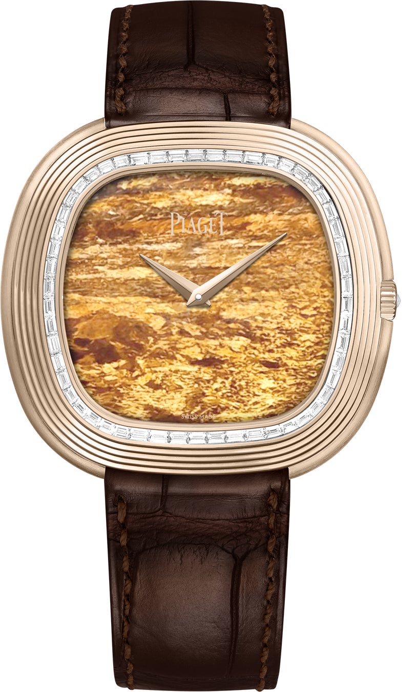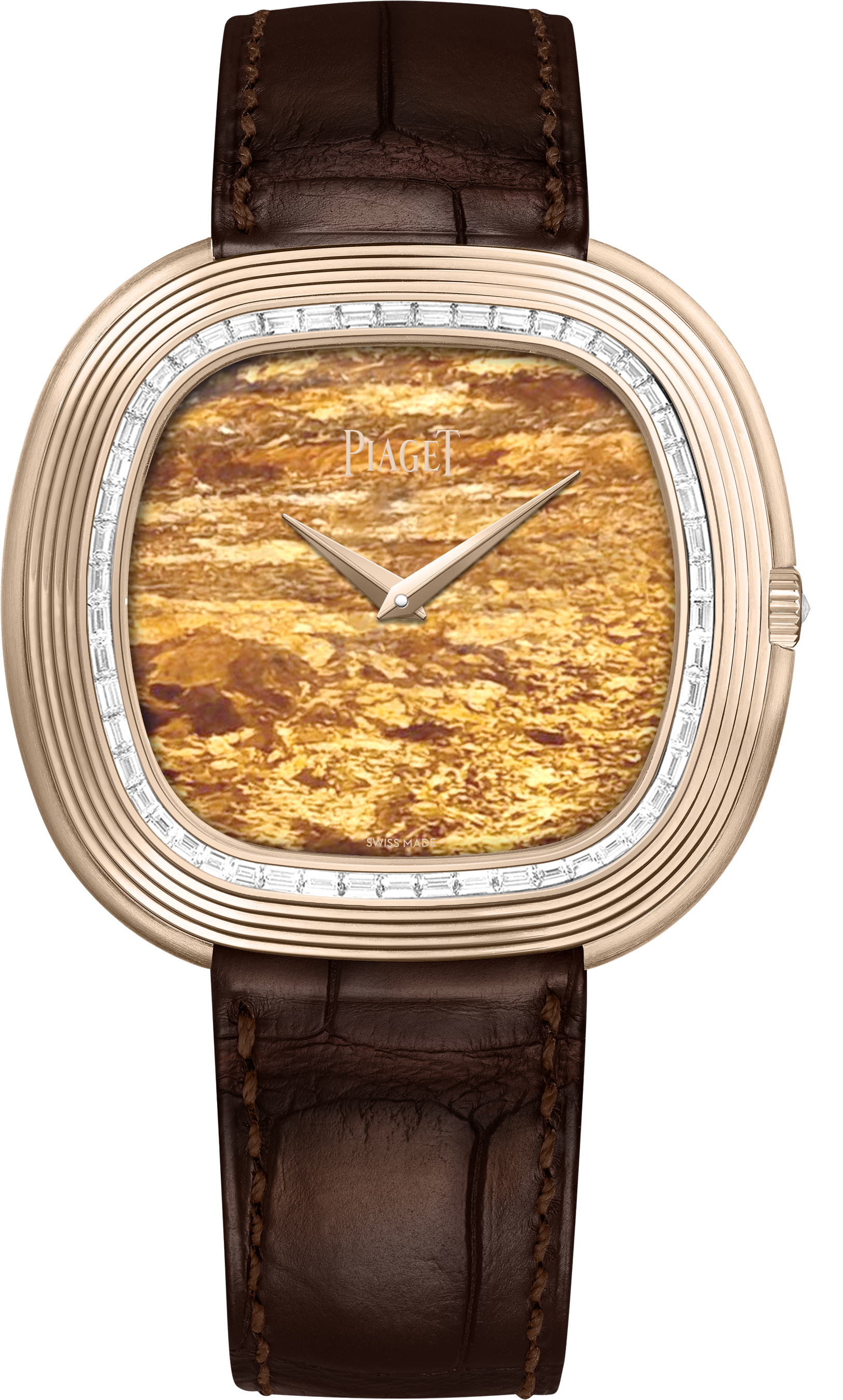 ピアジェがオーナメンタルストーンに魅了されたのは1963年、創業者ジョルジュ=エドワール・ピアジェの孫であるジェラルド・ピアジェとヴァランタン・ピアジェが、 スイスの会社をジュエリーとウォッチメイキング両方に特化した、モダンでファッション性の高いアプローチを採用する国際的なメゾンへと変革しようとしていたときでした。1957年に貴金属と希少素材のみを使用するという決定がなされ、デザインと創造性を解放した画期的な9P薄型手巻ムーブメントの発明によってこのプロセスが可能になりました。この革新的なムーブメントにより、ウォッチの伝説的な薄さを維持しながら、文字盤の拡大とオーナメンタルストーンによる装飾が可能になりました。文字盤はデザインの装飾的な焦点となり、ピアジェはそれを創造的表現の新たな領域として主張しました。