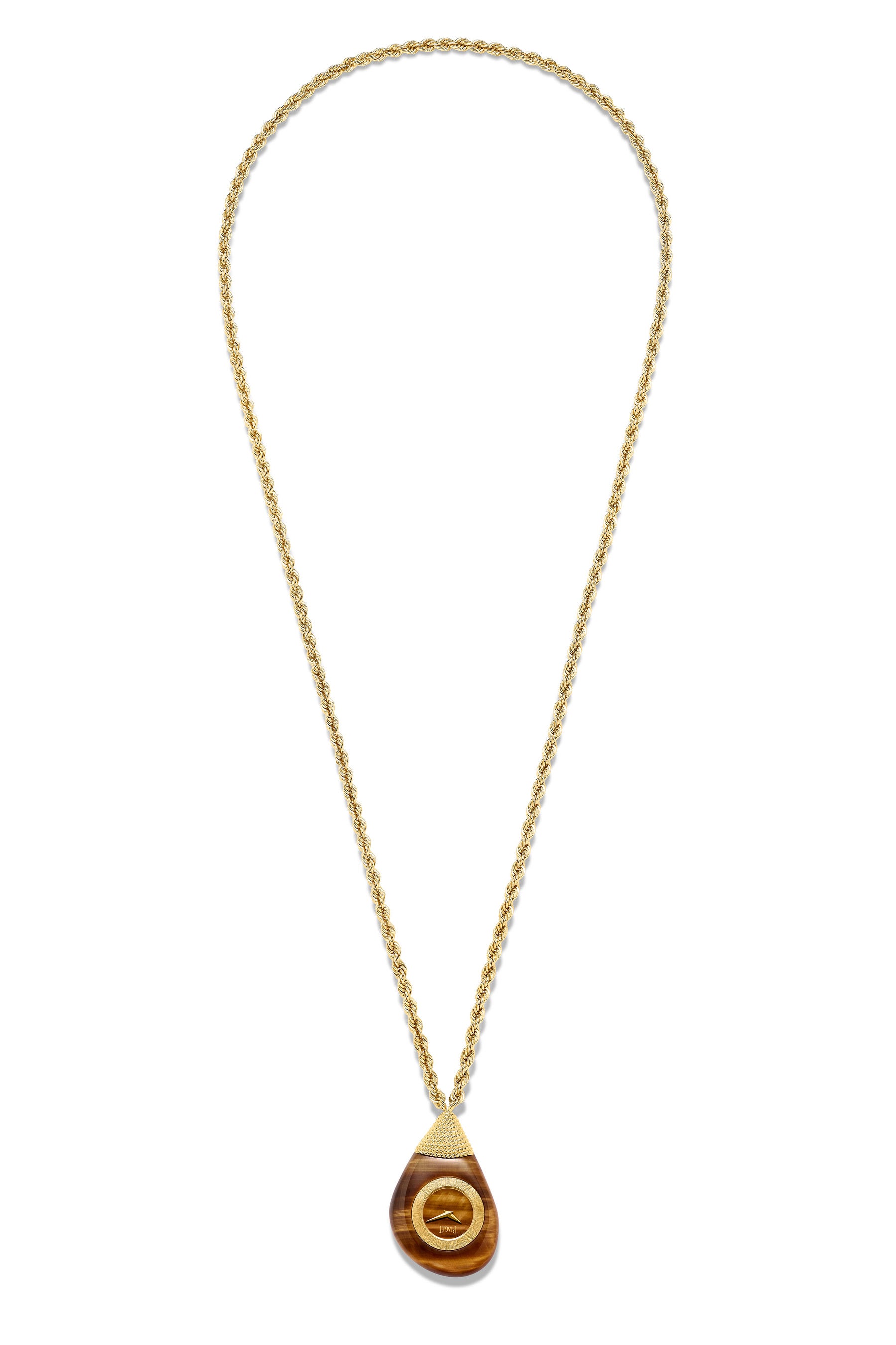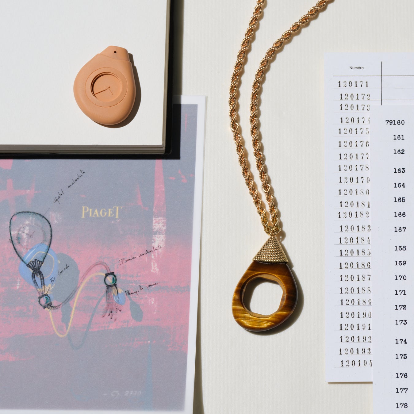 2023年に再導入されたカフウォッチとスウィンギング ソートワール ウォッチに続き、ハイジュエリーにアレンジした新たなSixtieでは、1970年代の象徴的なカフウォッチを再解釈しています。イヴ・ピアジェお気に入りの、ピアジェ ソサエティを反映するストーンのひとつ、多彩な色合いのオパールをSixtieの柔らかな台形フォルムの中に取り入れました。ピアジェの名高いデコ パレス(パレス装飾)を手作業でエングレーヴィングした、遊び心のあるアシンメトリー。自己表現の火花を再燃させたピアジェは、1972年に製作した懐中時計「Kimono」を、3本のスウィンギング ペブル ネックレスとして刷新しました。彫刻的で非対称な小石の形をした3本のウォッチは、撚り合わせたゴールドチェーンの下で揺れ動きます。それぞれがオーナメンタルストーン、ゴールドを帯びたタイガーズアイ、若草色のヴァ―ダイト、またはピーターサイトから巧みに彫り出され、ケースと文字盤はストーンと完全に一体化しており、ウォッチを触り心地の良い私的な宝物に変えています。