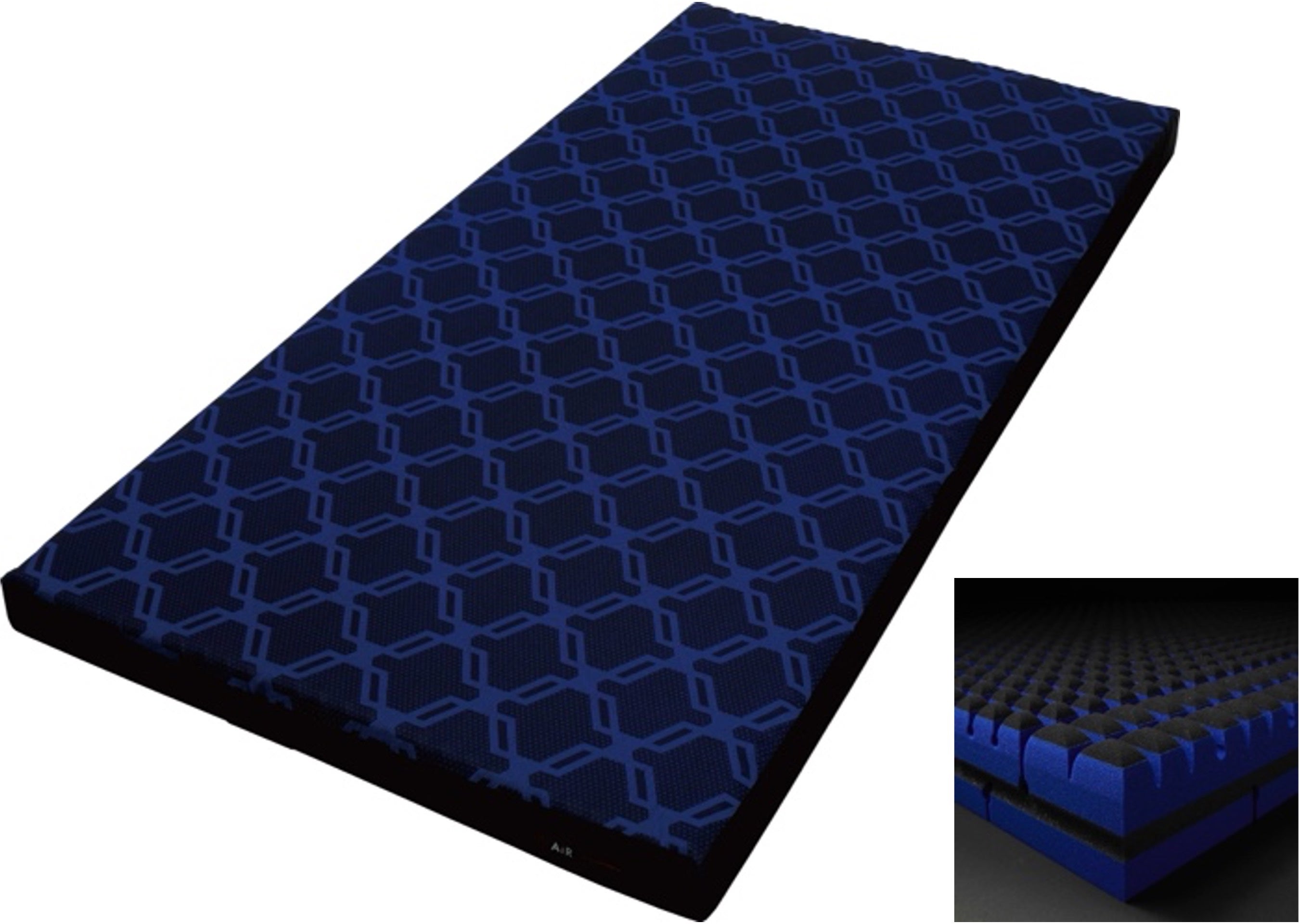 ○新構造(特許出願中):新開発の超高密度ウレタン素材を含む3種類のウレタン素材を採用し、[エアー]マットレスの上位モデル並みの機能を4cm厚に凝縮してモバイル仕様をつくり上げました。9つの点からなるブロックが完全独立した凹凸構造で、体圧分散性と寝姿勢保持性、高い通気性を発揮します。