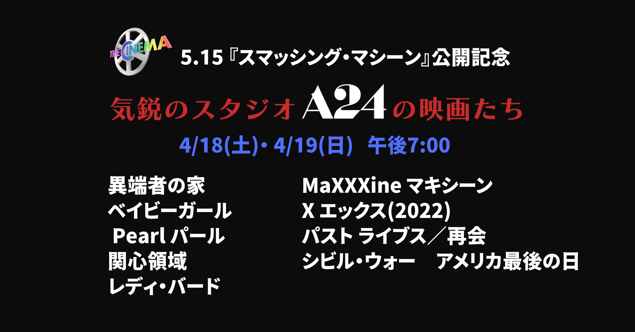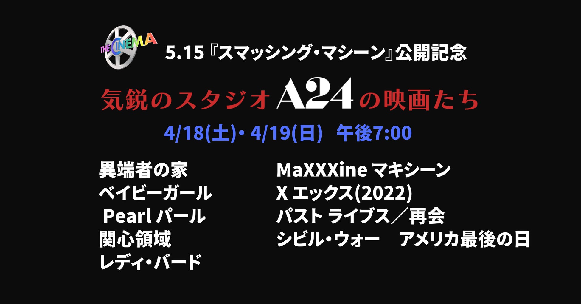 洋画専門チャンネル「ザ・シネマ」(株式会社AXNエンタテインメント、本社:東京都渋谷区、代表取締役社長 野島 亮司)では、ドウェイン・ジョンソンの好演が話題の新作映画『スマッシング・マシーン』(配給:ハピネットファントム・スタジオ)5月15日(金)の日本公開を記念し、独創的な世界観と鋭いセンスで映画界を席巻するインディペンデント映画スタジオ「A24」作品を特集いたします。予想のつかないスリリングな展開が批評家から絶賛された脱出サイコ・スリラー『異端者の家』、ハリウッドの暗黒面を描く、爽快なスターダム・スリラー・エンターテイメント『 MaXXXine マキシーン』、愛する夫と子供、キャリアと名声、すべてを兼ね備えながらも、満たされない渇きを抱える主人公をニコール・キッドマンが熱演し、ヴェネチア国際映画祭では最優秀女優賞を獲得した『ベイビーガール』など、国内TV初放送を含めた全9作品を4月18日(土)、19日(日)にお届けいたします。また、この特集を記念し、プレゼントキャンペーンを実施。映画ファンに大人気の「A24オフィシャルグッズ」を合計10名様に抽選でプレゼントいたします。
