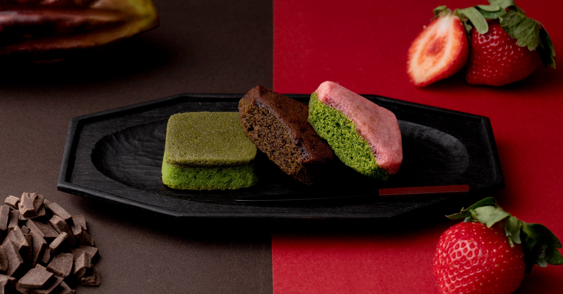 今回、全国の抹茶スイーツ好きの方に向けて、濃厚で色鮮やかな定番の抹茶(2個入り)、いちご抹茶(2個入り) 、チョコほうじ茶(2個入り)といった計6個入りのセットを、ハートフルな想い伝わる深紅の限定パッケージで展開します。期間限定となりますので、お見逃しなく。