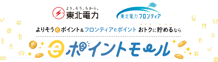 お客さまは「eポイントモール」を通して、お買い物やアンケートの回答をすることでポイントを貯めることができ、そのポイントを東北電力の「よりそうeポイント(https://www3.zf1.tohoku-epco.co.jp/)」や東北電力フロンティアの「フロンティアeポイント(https://www.tohoku-frontier.co.jp/myfrontier/point/)」に交換が可能です。(※)