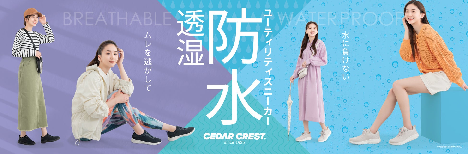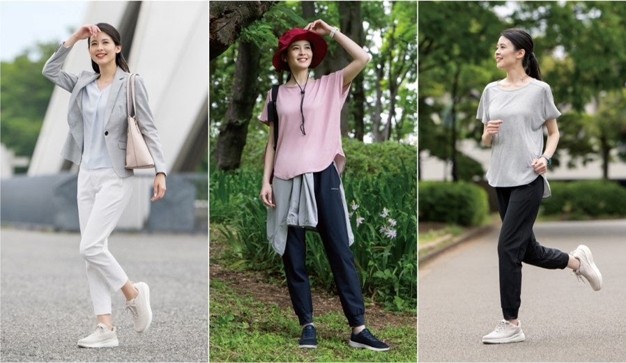 商品機能は、靴内部に特殊フィルムを内蔵し、外からの水の侵入を防ぐ『防水性(※)』と、靴内部に篭る湿気を外に通す構造『透湿性』の2つの機能を兼ね備えており、軽いランニングやスポーツシーンはもちろん、ジャケットなどのお仕事スタイルにも最適です。強力グリップで歩行をサポートし、厚底ミッドソールで衝撃を吸収するランニングタイプ(CC-9403)と、軽量かつ衝撃吸収性に優れたEVAソールを使用し、ゴムレース仕様で、脱ぎ履きもスムーズなカジュアルタイプ(CC-9404)の2種類で、どちらもコーディネートしやすいカラーバリエーションが揃っています。定番のブラック、ネイビーに加え、肌馴染みが良く足を美しく見せてくれるグレーベージュカラーもお勧めです。※接地面から4cm5時間の防水設計(完全防水ではありません)