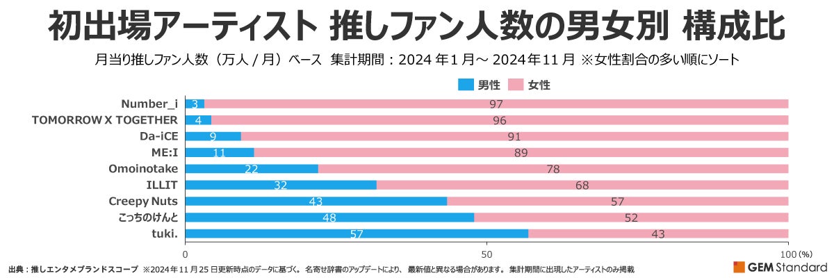 今年の紅白歌合戦には、10組もの初出場アーティストが選ばれました。以下は、「推しエンタメブランドスコープ」で2024年1月から11月の期間でデータが確認できる初出場の9組について男女比で比較したチャートです。