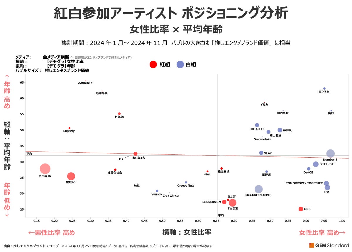 年末恒例の音楽番組「第75回NHK紅白歌合戦」の出場歌手が発表されました。出場歌手を応援する「推しファン」の熱量がどのように番組を盛り上げるか、注目されます。そこで、エンタテイメント業界に向けたデータ×デジタルマーケティングサービスを提供するGEM Partners株式会社(ジェムパートナーズ、所在地:東京都港区、代表取締役:梅津文)は、音楽アーティスト別に推しファンの属性や熱量を分析できる「推しエンタメブランドスコープ」のデータをもとに、番組全体でどのような人を惹きつけているのかを紐解いてみました。