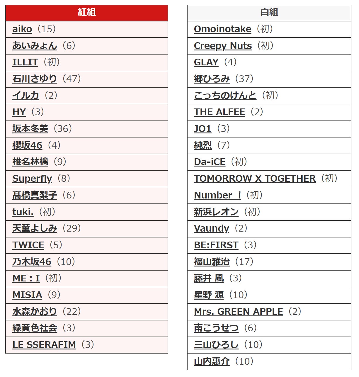 「第75回NHK紅白歌合戦」の出場歌手は以下のとおりです。※()内は紅白歌合戦出場回数
