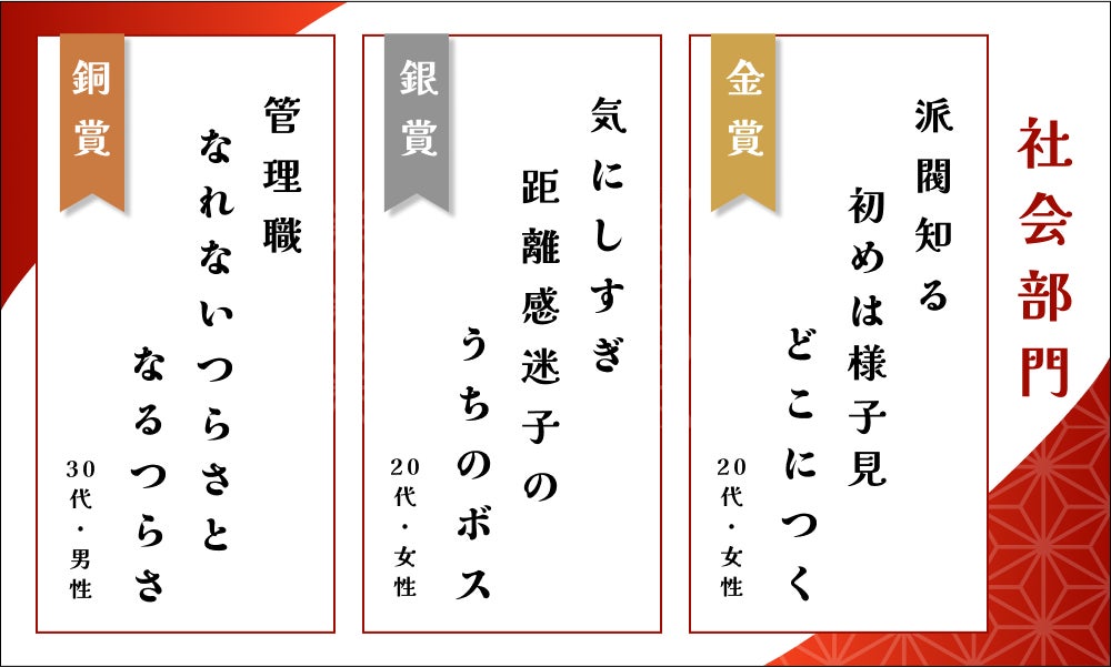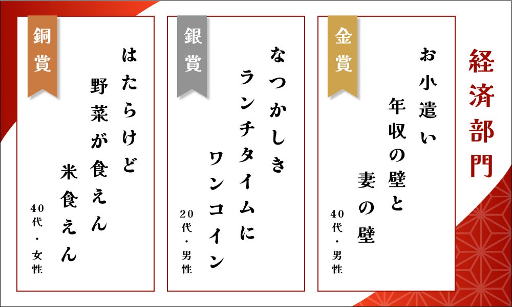 今回で3度目(※2)となる『Job川柳』では、昨今の社会情勢や職場の風潮の変化を受け、「はたらく社会人の本音」をテーマに募集をいたしました。応募作品には、職場コミュニケーションやはたらき方への変化を求める作品が多く集まりましたが、中でも賃上げ及び物価高など”経済”にまつわる句や、ハラスメントや世代別の本音など”社会的”な句が目立ったことから、2024年を象徴した「経済」と「社会」の2部門に分けて選出を行いました。