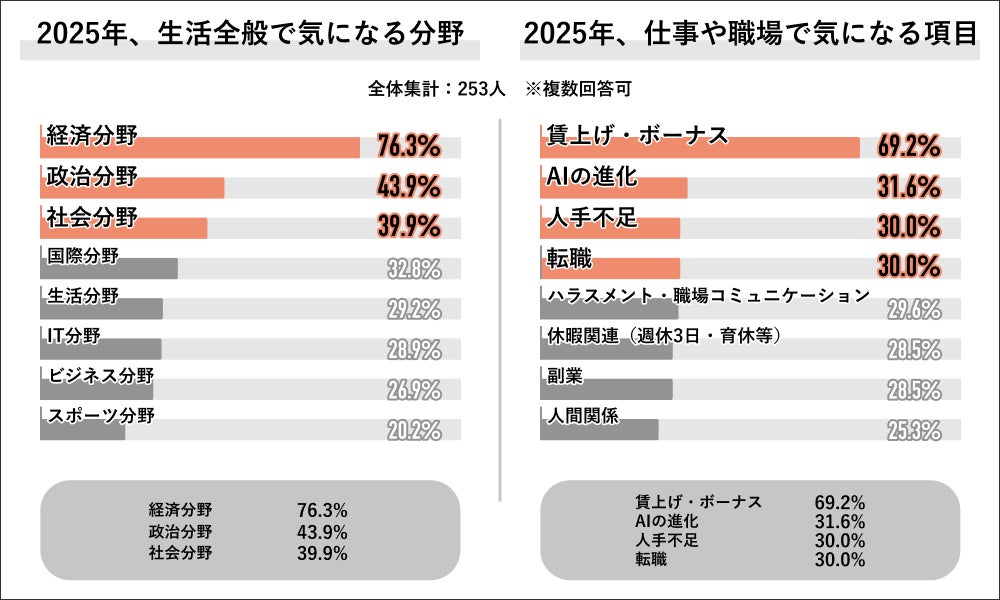 回答者全体の253人に2025年に生活全般で気になる分野を聞くと、「経済分野」が76.3%で最多となり、次いで「政治分野」が43.9%、「社会分野」が33.9%でした。また、2025年に仕事や職場関連で気になる項目を聞くと、「賃上げ・ボーナス」が69.2%で最多となり、次いで「AIの進化」が31.6%、「転職」「人手不足」が同率で30.0%でした。