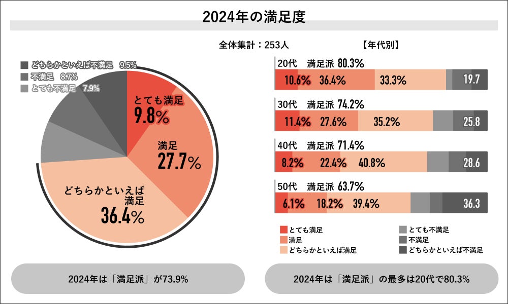 回答者全体の253人に2024年の満足度を聞くと「満足派」が73.9%で過半数を占め、内訳は「とても満足」9.8%、「満足」27.7%、「どちらかといえば満足」36.4%でした。年代別では20代の「満足派」が80.3%で最多となり、次いで30代が74.2%、40代が71.4%、50代が63.7%という結果になりました。