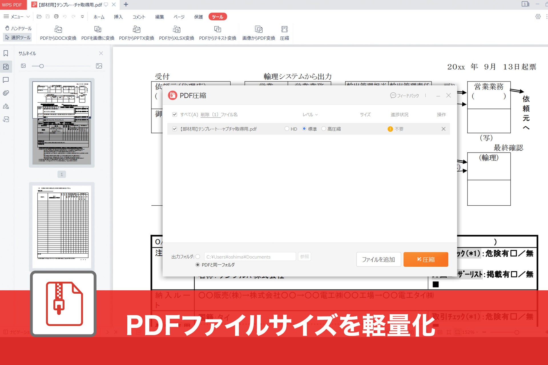 PDFファイルを圧縮して、ファイルサイズを軽量化できます。