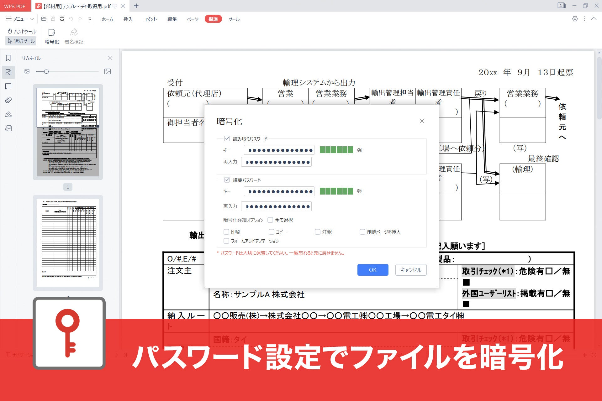 情報漏洩を防ぐ読み取りパスワード、編集パスワード設定でファイルを暗号化できます。また、署名を付与することもできます。