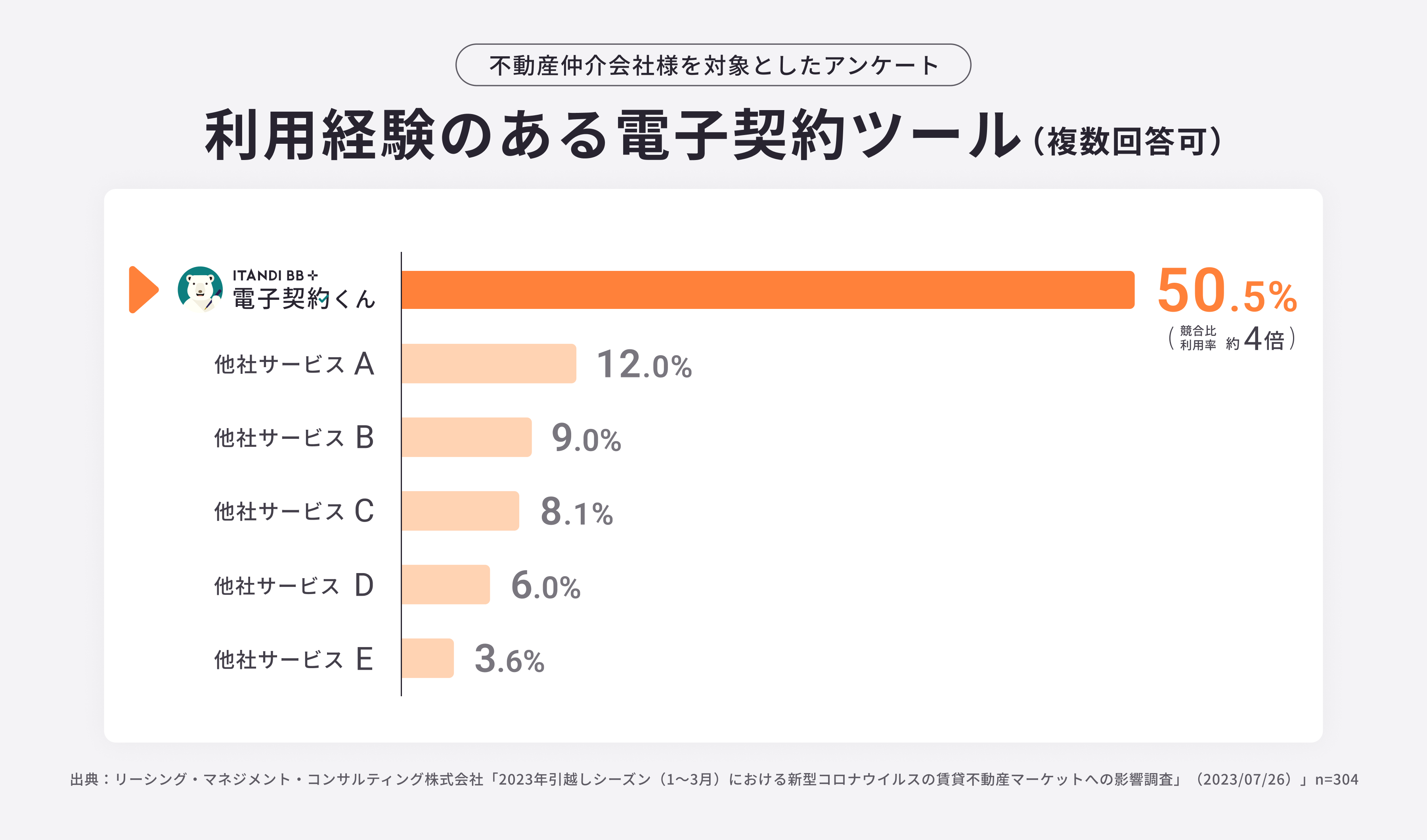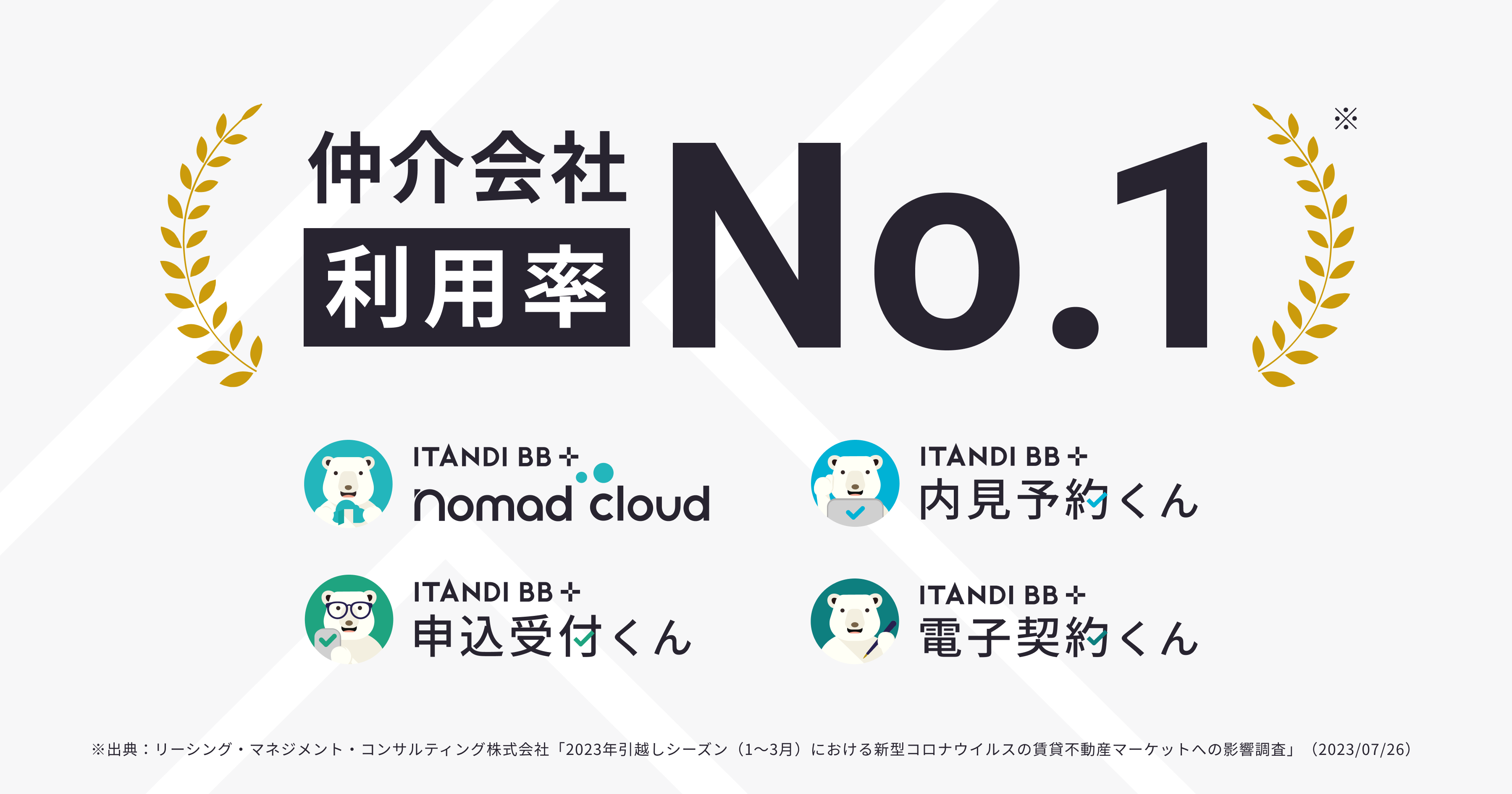 この度、リーシング・マネジメント・コンサルティング株式会社が、首都圏1都3県の不動産賃貸仲介会社(以下「仲介会社」) 333社に対して実施した「2023年引越しシーズン(1~3月)における新型コロナウイルスの賃貸不動産マーケットへの影響調査(以下「本調査」)」において、賃貸住宅の内見予約WEB 受付システム「内見予約くん」、不動産関連WEB申込受付システム「申込受付くん」、不動産関連電子契約システム「電子契約くん」、顧客管理・自動物件提案システム「ノマドクラウド」の4サービスで仲介会社の利用率No.1を獲得しました。