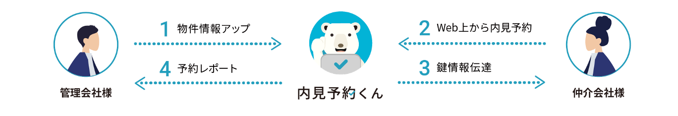内見予約の受付作業や鍵情報の照会作業を自動化することで、24時間365日いつでも内見予約をすることができる、賃貸住宅の内見予約WEB 受付システムです。内見予約の自動化により、賃貸不動産管理会社は業務を効率化し、予約重複等のトラブルを防ぎます。また、宅建業を許可されていない不正業者の自動チェック機能もあり、犯罪の抑制にも貢献します。入居希望者にとっては素早く効率的に希望の部屋を内見できるようになり、利便性が向上します。
