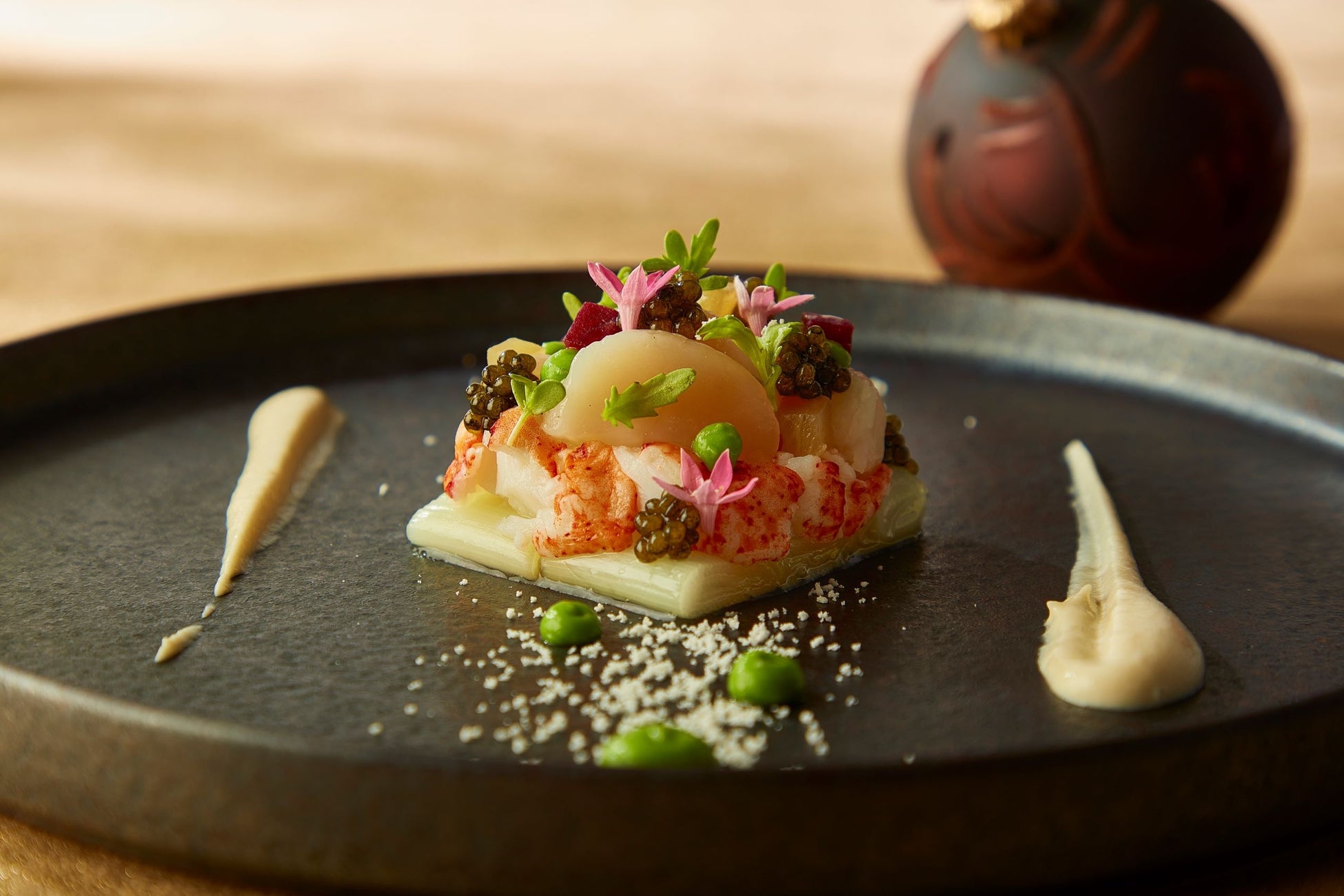 Fish Bank TOKYOで長年愛されているスペシャリテ「ウニのフラン」をリース仕立てのクリスマススタイルにした一皿から、前菜はFish Bank TOKYOが厳選したキャビア・オマール海老・ホタテを取り揃え、お魚料理は国産ハタを香ばしく焼き上げ味わい深い蕪と一緒に、