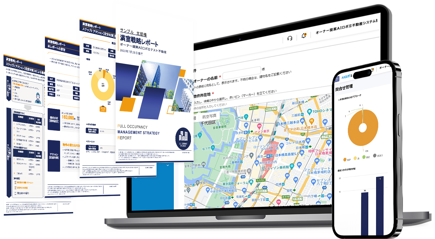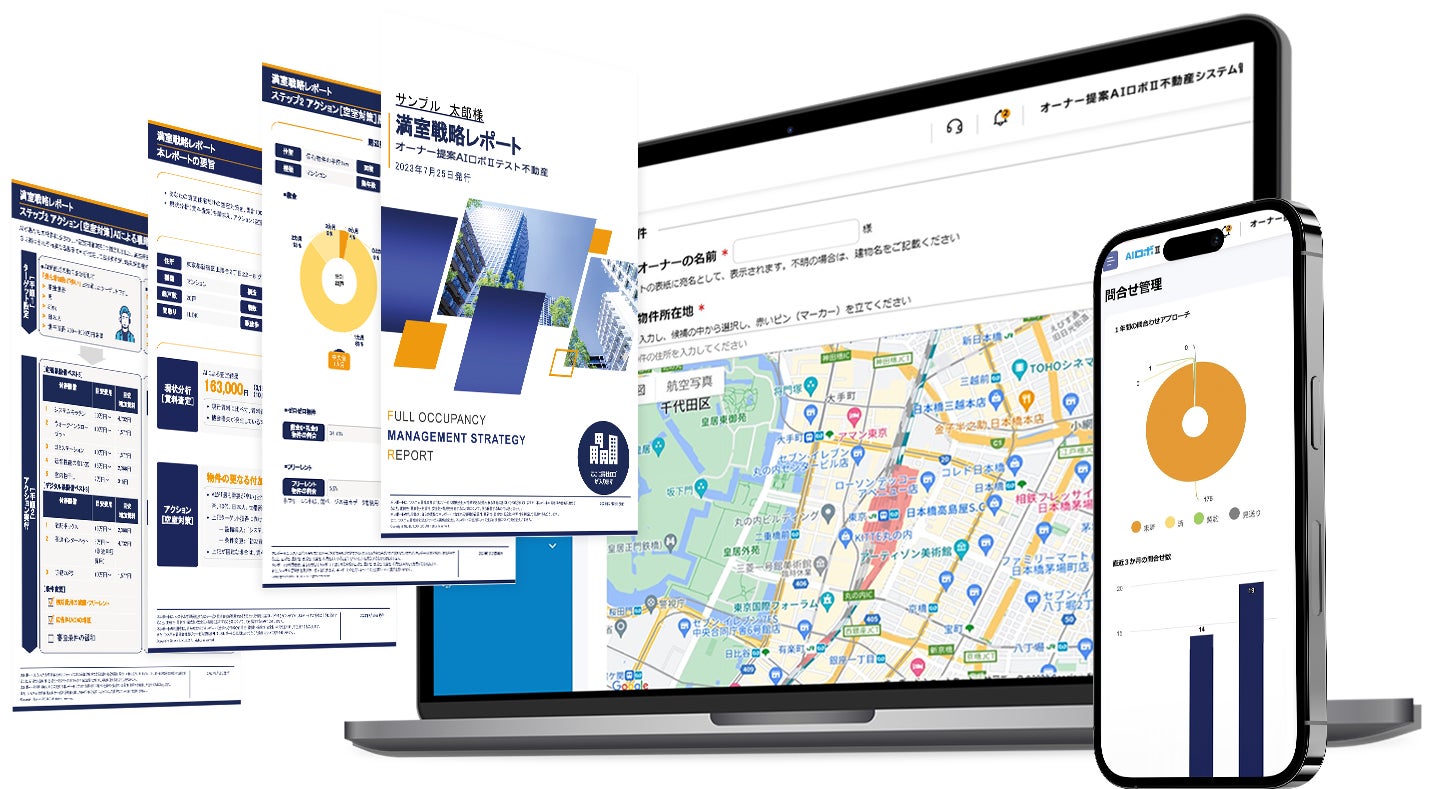 「オーナー提案AIロボⅡ」とは、賃貸住宅ごとに異なる高度な「満室戦略レポート」をWEB上で作成でき、高度なAI賃料査定と空室対策を論理的に行える賃料査定・空室対策提案ツールです。