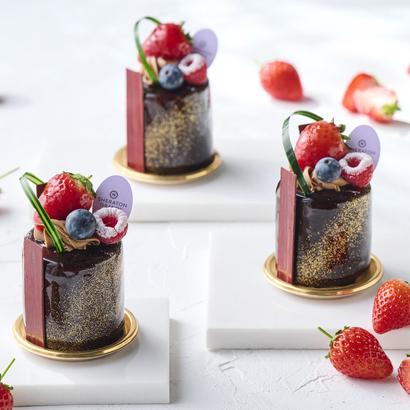 漆のように艶やかなグラサージュショコラでコーティングした高級感溢れるムースケーキです。チョコレートムースの中のジャム、ガナッシュ、ムースといった異なるテイストのいちごをチョコレートと共に堪能できる一品です。
