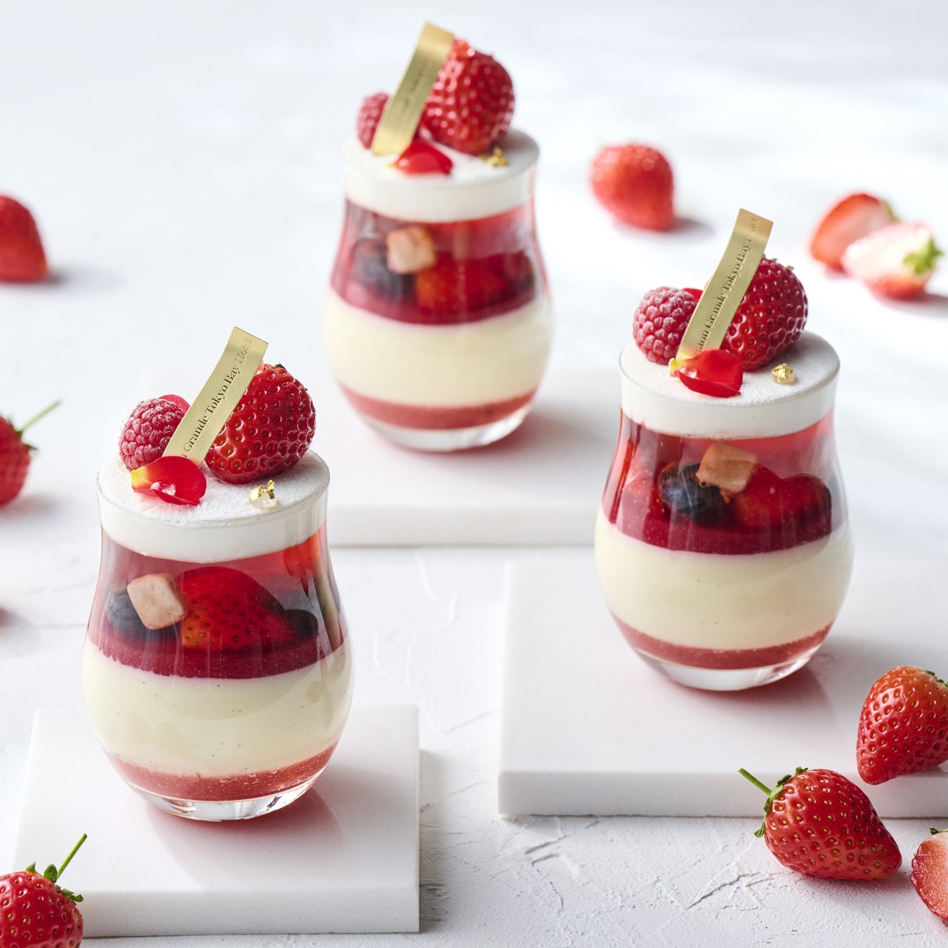 いちごソースにシャンパンムース、さらにはベリーの果肉が詰まったゼリーを重ねた、ワインレッドが優艶なグラスデザートです。上品なシャンパンと酸味の効いたベリーがシンクロし、至極の味わいを演出します。