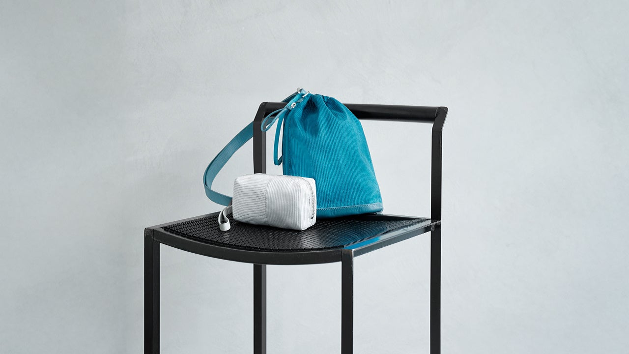 素材:絹、牛革、綿(オレンジ、ライトグレー)/絹、山羊革、綿(ブルー、ブラック)