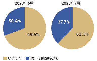 保育士バンク!の利用実績をもとに、当月の園の募集要件で、入職する タイミングが「いますぐ」なのか「次年度開始時」なのかの割合を算出、 前月と比較。