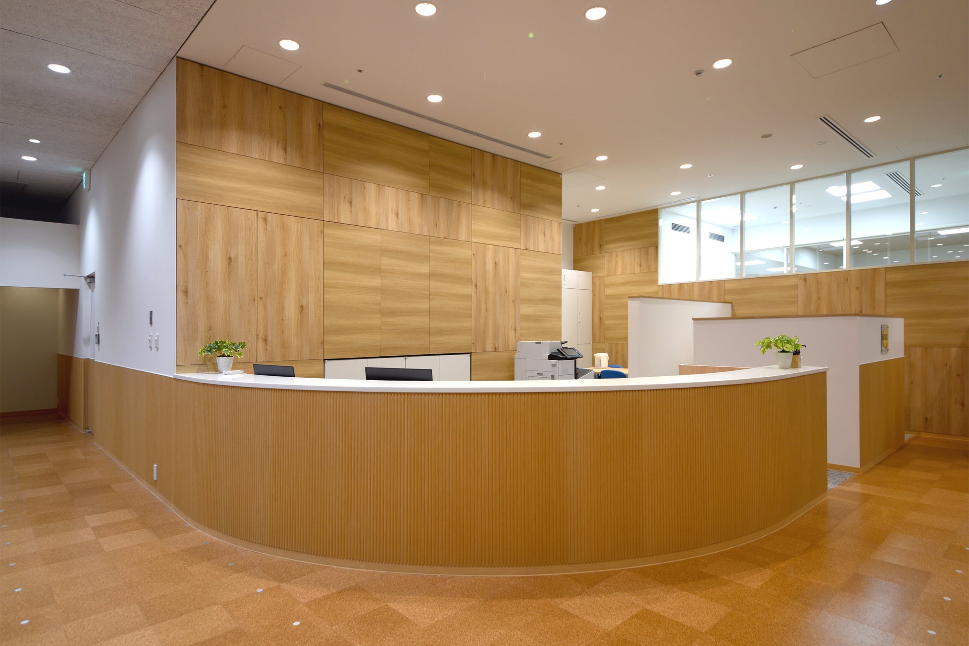 「タンボア」は、平面から曲面まで施工可能な壁装材です。基材に天然木のツキ板を施したリズミカルな断面形状で、天然木の風合いを立体的に表現します。曲面のカウンター側面への使用に加え、不燃認定取得のタイプは壁面全体への施工も可能で、ホテルやオフィス、受付などに幅広く採用されています。