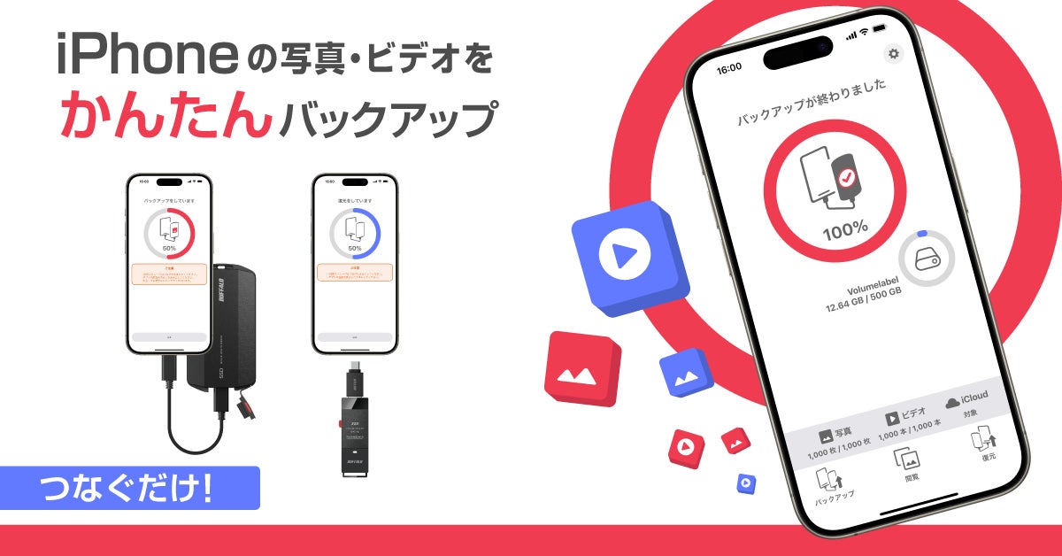 本アプリケーションは、iPhoneの容量不足に悩む多くのユーザーの声に応え、2024年11月20日より提供を開始しました。iPhone・iPadとSSDなどの外部USBストレージを接続し、アプリケーションを起動するだけで写真・ビデオを手軽にバックアップできます。複雑な設定や難しい操作を必要とせず、直感的な画面デザインにより、デジタル機器の操作に苦手意識をお持ちの方でも迷うことなく安心してご利用いただけます。また端末内蔵ストレージの写真・ビデオだけでなく、iCloudフォトライブラリーに保存されているデータに対応している点も特長です。散在している大切な思い出の写真・動画をまとめてUSBストレージ内で整理できます。