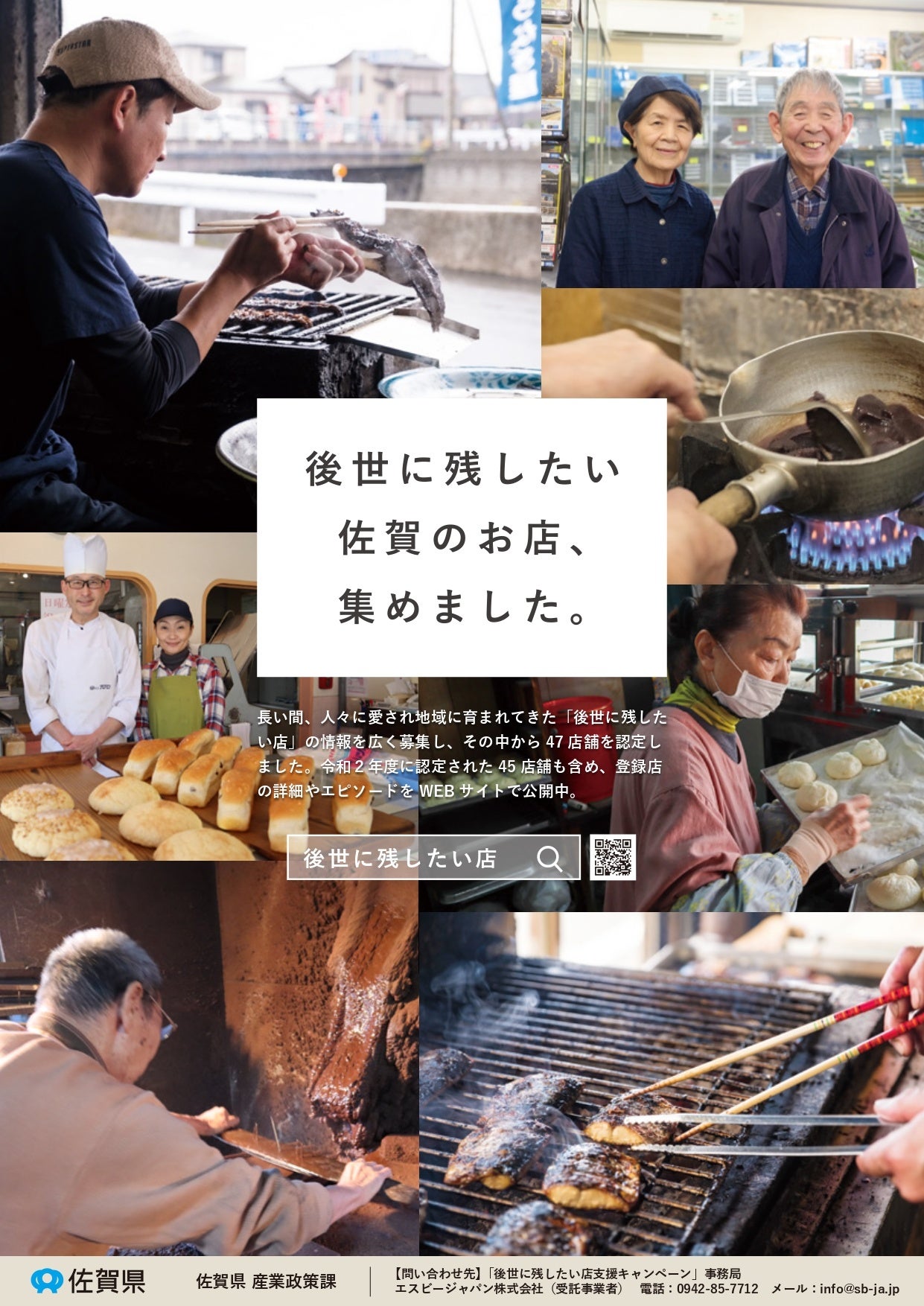 佐賀県民から「後世に残したい」と思う地元の飲食店・小売店などを募集し、それら店舗の価値を県内外に情報発信するとともに、経営者の事業承継の意欲喚起と後継者探しのフォローをおこない、将来的な事業承継の促進を図っていく事業です。