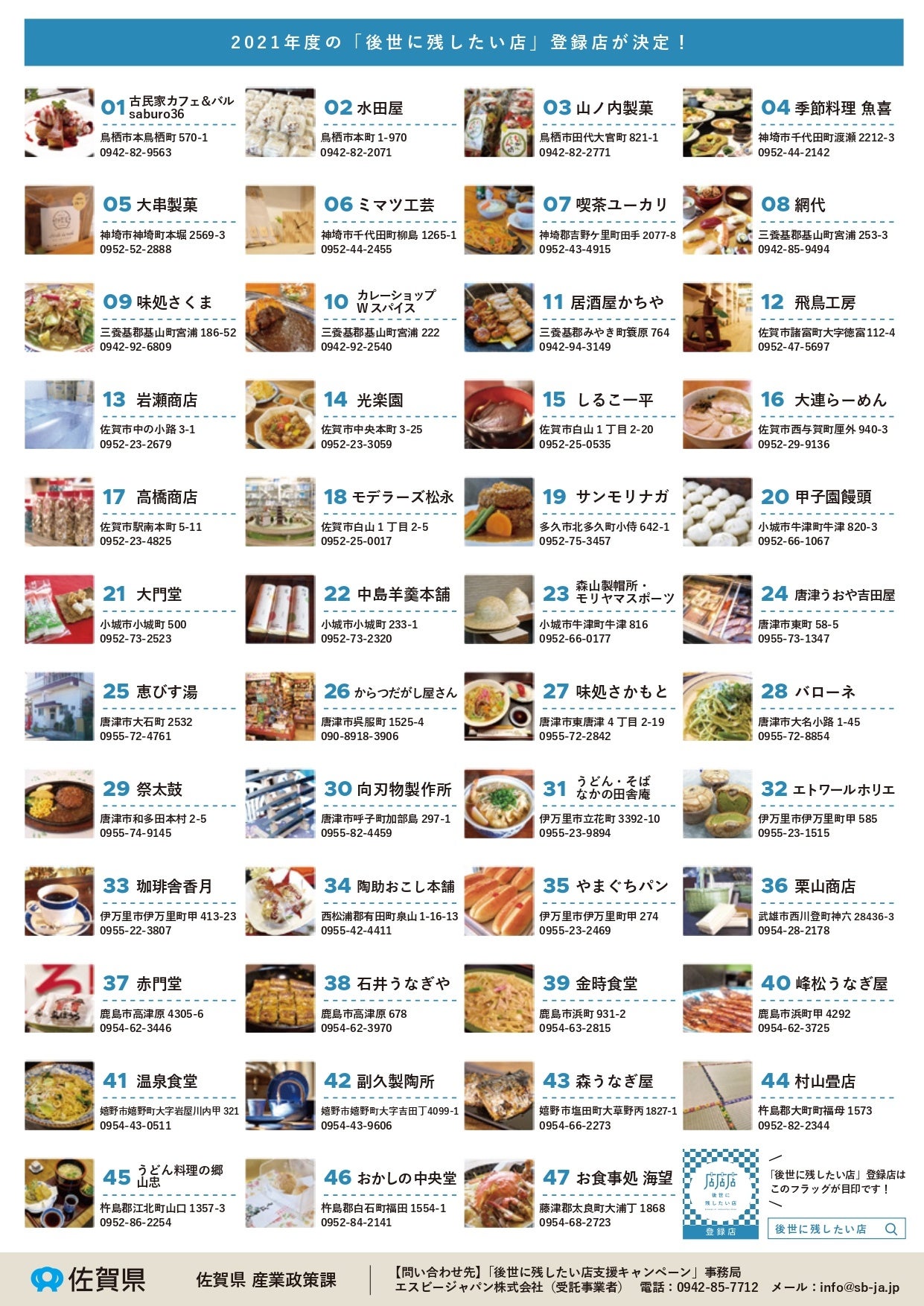 自治体の観光プロモーション・地域ブランディングをサポートするエスビージャパン株式会社(代表取締役:中元英機、 以下当社)が事務局をおこなう佐賀県主催「後世に残したい店支援キャンペーン」では、令和3年度の選定店舗47軒が決定しました。長い間、人々に愛され地域に育まれてきた「後世に残したい店」の除法を広く募集し、その中から認定しました。令和2年度に認定された45店舗を含め、登録店の詳細やエピソードをWEBサイトで公開中です。