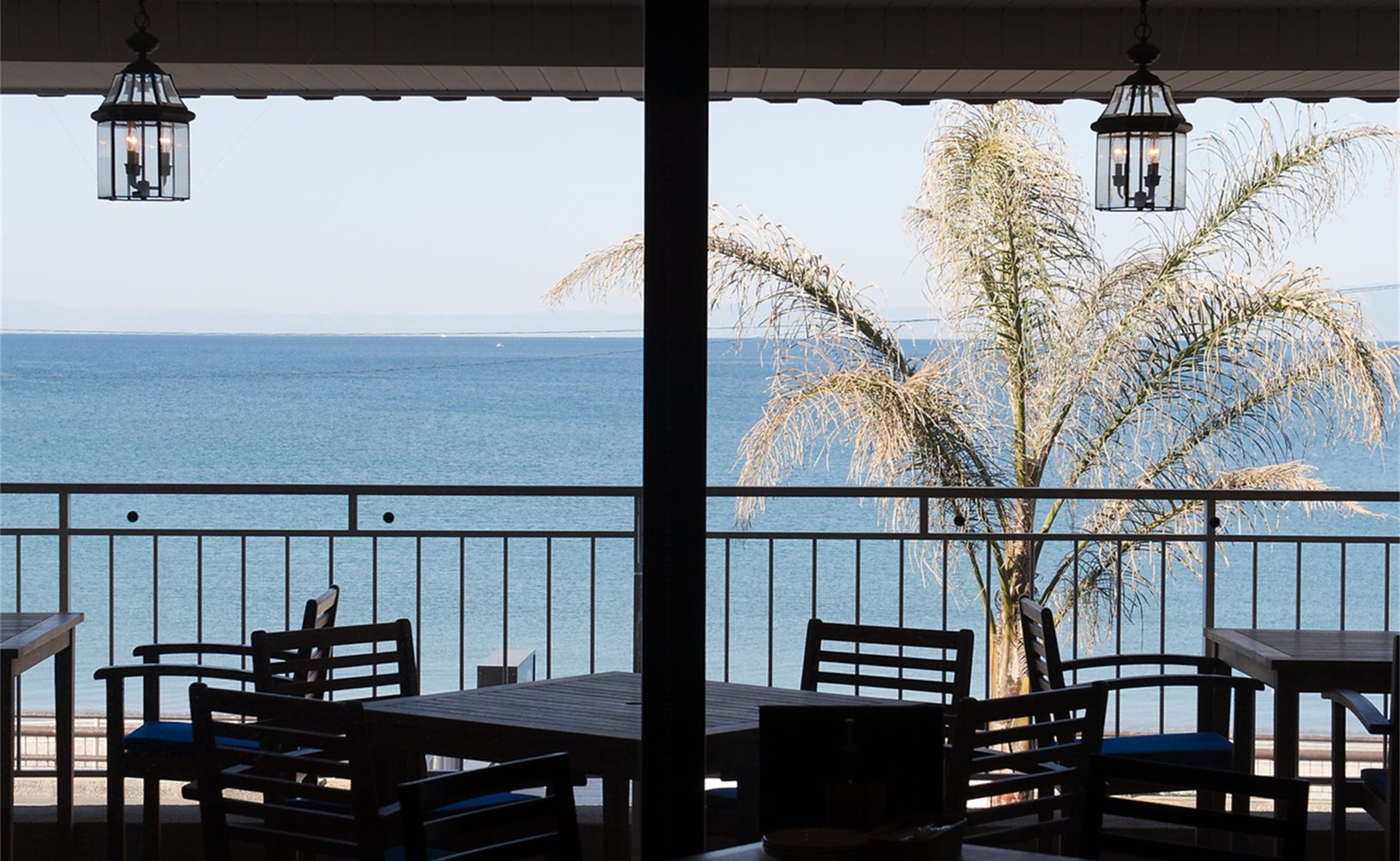 目の前に広がるのは逗子海岸と海。岬に囲まれた逗子の海がすべて視界に入るオーシャンビューです。席数はテラス席36席と、個室4部屋(24席)を含む全170席。テラス席からはロマンティックな夜景も望めます。カフェ利用から貸し切りパーティーまで様々なシーンでご利用いただけます。