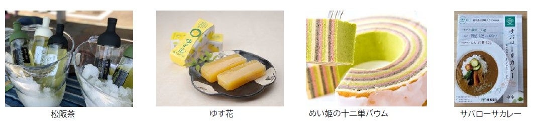 三重県中勢エリアに位置する4つの自治体が集い、各自治体の名産を販売します。松阪市からは「松阪牛入りカレー」や「松阪茶」、会場では水出し「松阪茶」の試飲を行います。大台町からは「奥伊勢ゆず」を使用したスイーツやドリンク、明和町からは伊勢神宮の天照大神に仕えた“斎王”が着ていた平安時代の十二単をモチーフにした美しい層がうりの「めい姫の十二単バウム」を販売します。多気町からは、本来であれば廃棄される食材を使用した「サバローサ―カレー」など、SDGs商品を販売いたします。