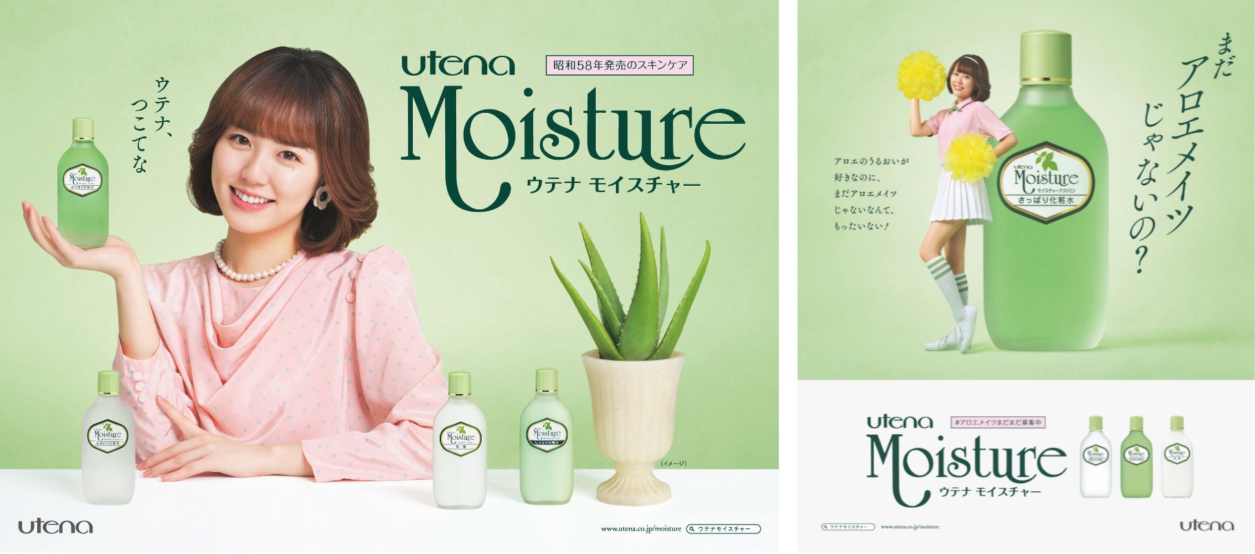 大阪での交通広告では、レトロな衣装や髪型で昭和のアイドルに扮した阪田マリンさんが「ウテナ、つこてな」と呼びかけます。東京での屋外広告では、昭和の歌番組のバックダンサーを思わせる衣装で「まだアロエメイツじゃないの?」と、アロエエキス(保湿成分)を配合した「ウテナ モイスチャー」を紹介しています。