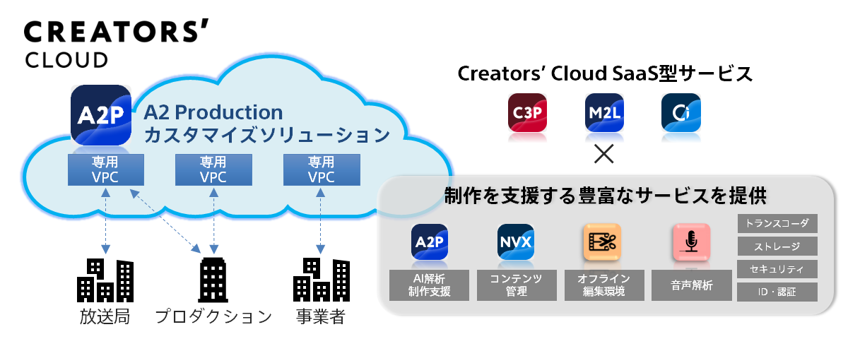 クラウド経由で撮影素材を伝送する「C3 Portal(シースリーポータル)」、クラウド中継システム「M2 Live(エムツーライブ)」、クラウドメディアストレージ「Ci Media Cloud(シーメディアクラウド)」などSaaS型サービスや、ワークフローソリューション「NavigatorX Cloud(ナビゲーターエックスクラウド)」によるコンテンツ管理など、クラウド制作プラットフォーム「Creators’ Cloud」で提供する豊富なサービスを、必要に応じてソリューションに組み込むことができます。また、配信システムとの連携のほか、オンプレミス環境とのハイブリッドな環境構築も可能です。既存の資産と併せて、クラウド映像制作環境を活用できます。