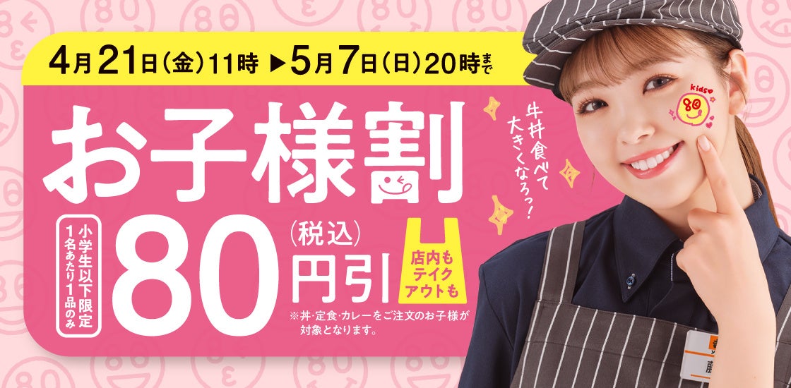 株式会社吉野家(本社:東京都中央区、代表取締役社長:河村泰貴、以下吉野家)は、4月21日(金)11時から5月7日(日)20時の期間、全国の吉野家店舗※でお子様の食事を税込80円引きする『お子様割』を実施します。