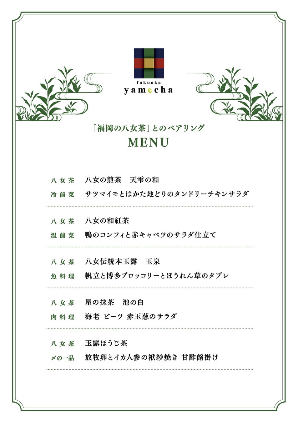 当日は、日本茶インストラクター岩井利恵氏による「福岡の八女茶」の淹れ方レクチャーと、厳選された「福岡の八女茶」と八芳園がプロデュースした料理とのペアリングイベントを実施致します。