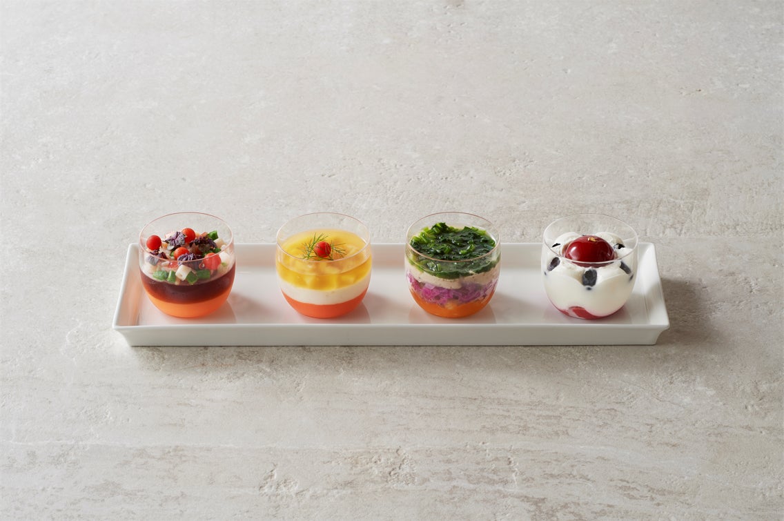 - オンライン商談サロンにご参加いただく方々には、5種の「福岡の八女茶」と、八芳園シェフがプロデュースしたティーペアリングを楽しめるお料理を配送させていただきます。