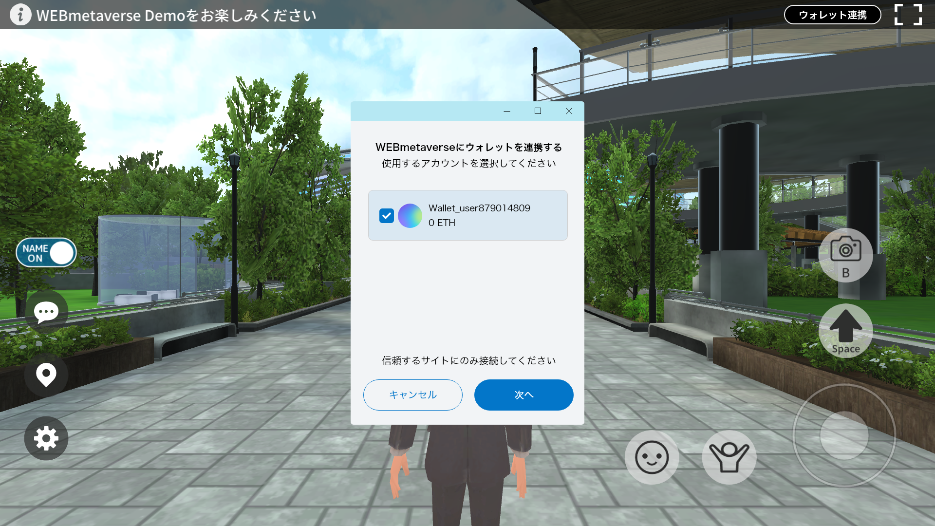WEBmetaverse内に用意されたウォレット連携ボタンから、暗号資産ウォレットを連携します。その後、ブロックチェーン上の購入情報からWEBmetaverse内で利用可能なNFTをユーザが所有していることを確認し、そのNFTをメタバース上で利用できるようになります。