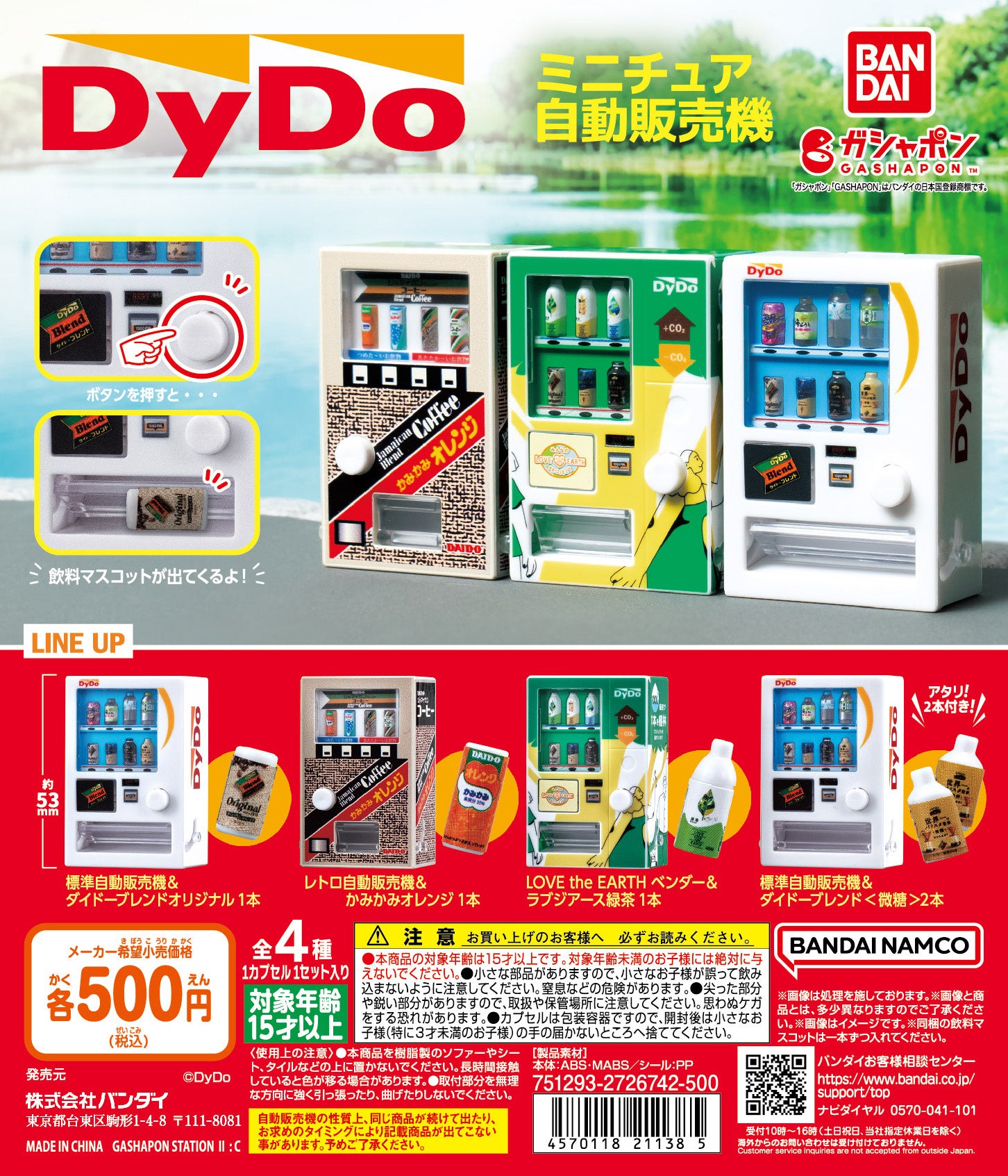 ミニチュアになって登場するのは、おなじみの①「標準自動販売機&ダイドーブレンドオリジナル1本」、1977年に登場したレトロかわいい②「レトロ自動販売機&かみかみオレンジ1本」、エコに配慮した③「LOVE the EARTHベンダー&ラブジアース緑茶」、ルーレットで「アタリ」が出た時と同様にアタリを含めた飲料マスコットが2本ついている④「標準自動販売機&ダイドーブレンド<微糖>2本」の全4種です。