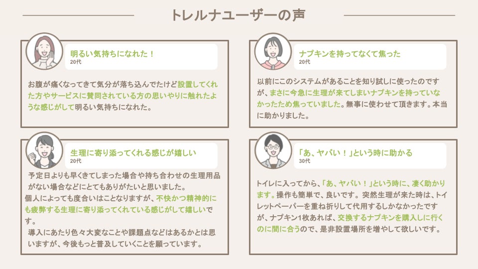 こうした背景のもと、トレルナは、生理用ナプキンの無料提供を通じて、社会全体の意識改革と行動変容を促進しています。トレルナの設置が広がることで、性別を問わず社会全体で生理についての理解が深まる重要な一歩となり、必要な人が必要な時に生理用ナプキンを手に入れられる環境があたりまえとなるよう、誰もが安心して過ごせる社会の実現を目指しています。