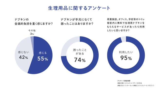 生理は「予定日と関係なく突然始まってしまう」「出先で生理用品を持ち歩くのを忘れてしまう」「恥ずかしいので他人に分からないように生理用品を持ち運ばなければならない」といった不便さや戸惑いが日常的に伴うものです。ネクイノが行った調査では、約3人に2人がナプキンが手元になくて困った経験があり、約半数が生理用品の購入に金銭的負担を感じていることが分かりました。また、95%が「無料で生理用品が提供されるサービスがあれば利用したい」と回答しています。