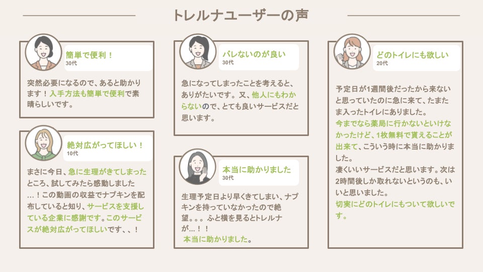 サービスの広がりとともに実際にご利用いただいた方からのメッセージが多く届いています。「トレルナがあって本当に助かった」「どのトイレにもついてほしい」「サービスを支援してくれている企業に感謝」など、トレルナを利用された方の声を一部ご紹介します。