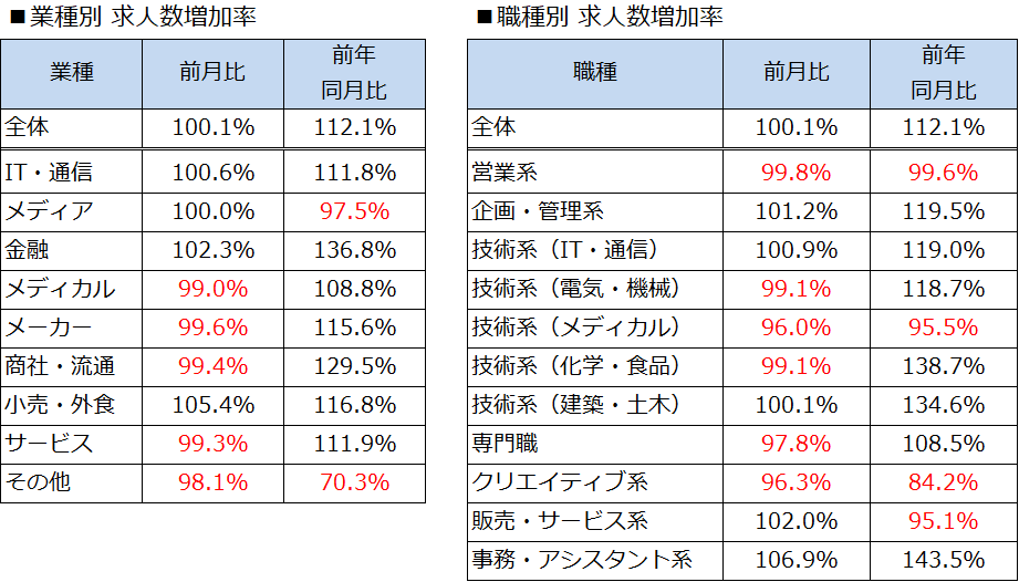 ・業種別では、8業種(「その他」を除く)のうち「IT・通信」「メディア」「金融」「小売・外食」の4業種で前月から求人数が増加。