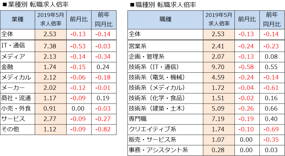 ・2019年5月の求人倍率は2.53倍(前月比-0.13pt/前年同月比-0.14pt)。