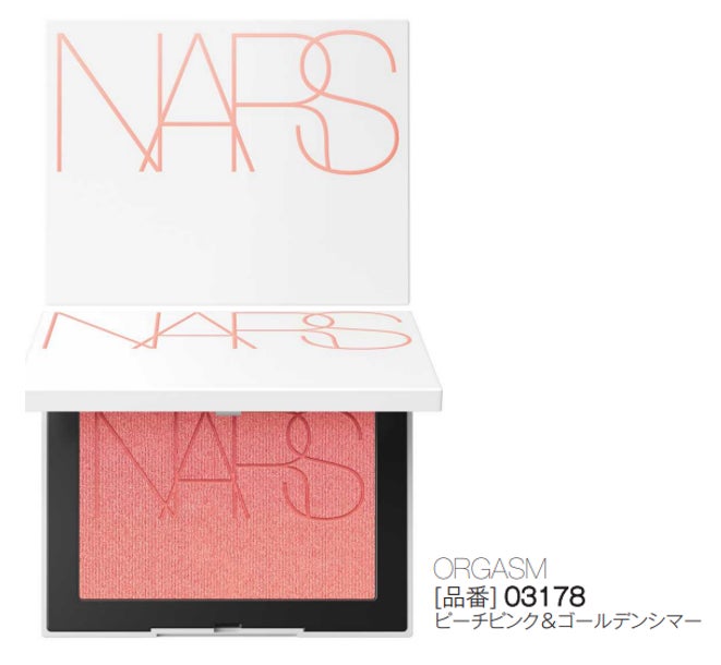 NARSのアイコニックシェードである“ORGASM(オーガズム)”のライトリフレクティング ブラッシュについて「新処方になったことできらめきや艶やかさが増して、より立体的な印象に仕上がります。つける時に顎をあげると、頬骨の位置がわかりやすくなるので、ほほの高い位置に頬骨に合わせて大きいブラシで入れ、残りを鼻先などにもなじませ血色感をプラスしています」。