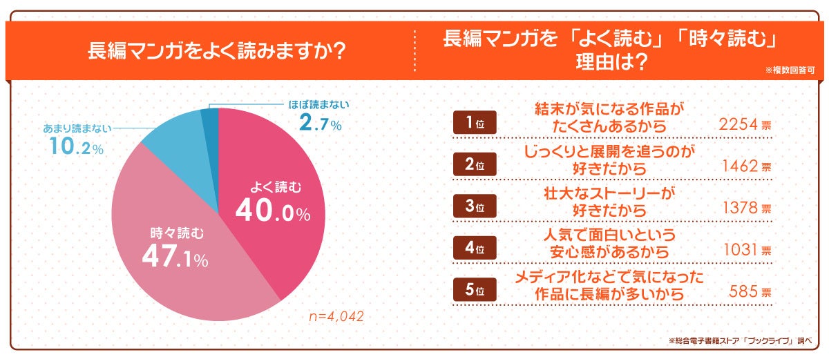 - 長編マンガを「よく読む」「時々読む」と答えた人の合計は約9割、結末が気になる作品がアレもコレも…
