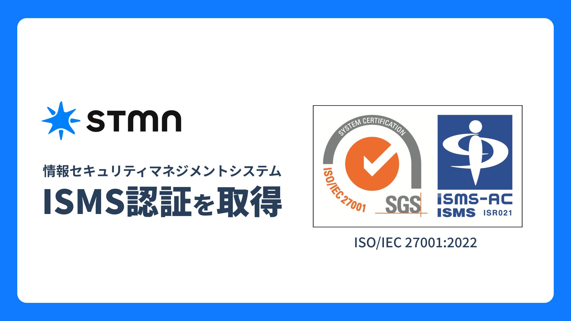 株式会社スタメン(東京本社:東京都千代田区、代表取締役:大西 泰平、以下 当社)は、情報セキュリティマネジメントシステム(ISMS)に関する国際規格「ISO 27001」(ISO/IEC 27001:2022)の認証を取得いたしました。