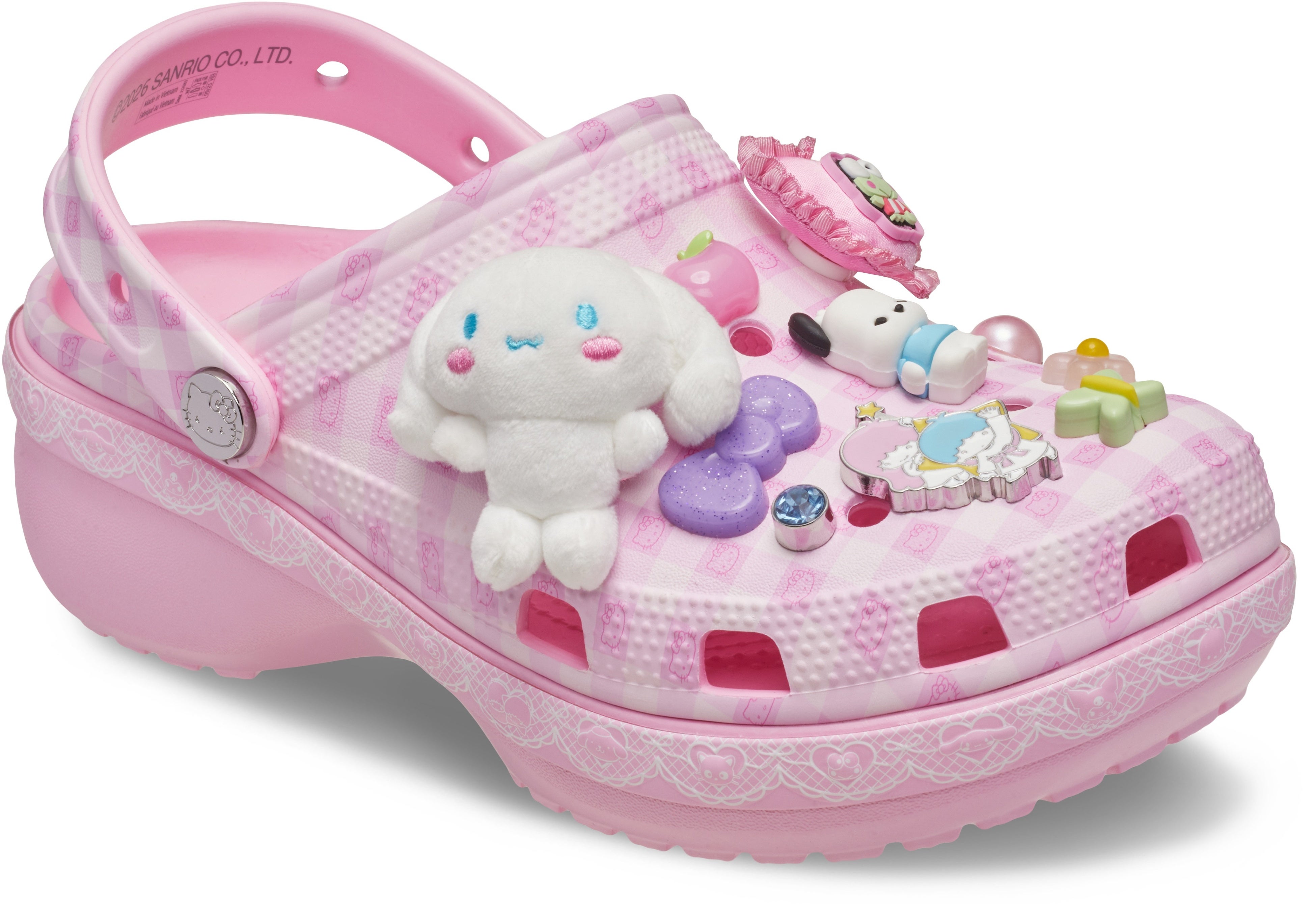 「ハローキティ アンド フレンズ クラシック プラットフォーム クロッグ」は、全面にピンクのギンガムチェック柄をあしらい、小さくハローキティのフェイスがプリントされた、遊び心あふれるデザインです。サイドにもハローキティ、ポチャッコ、リトルツインスターズたちがプリントされ、どこから見ても可愛さを楽しめる一足に仕上げました。また、約1.6cmのプラットフォームソールで、程よくスタイリッシュなシルエットを楽しめます。さらに、リベット部分にはシルバーのハローキティをあしらい、細部まで世界観を表現しました。本アイテムには、19個のジビッツ™ チャームが付属し、編みぐるみ風のハローキティや、ふわふわとしたぬいぐるみのシナモロールやポムポムプリンのチャームなど、存在感のあるデザインが揃っています。サンリオキャラクターズの魅力をぎゅっと詰め込んだ特別な一足です。