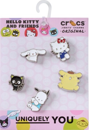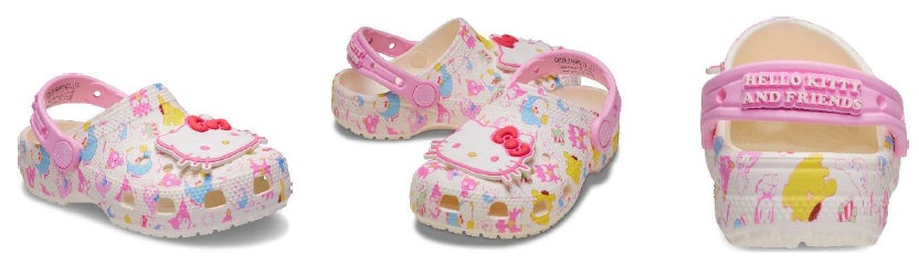 「ハローキティ アンド フレンズ パステル クラシック クロッグ」は、バッドばつ丸やタキシードサムなどサンリオキャラクターズを全面にプリントしたスイートで愛らしいビジュアルが特長です。さらにおでかけのワンシーンを写真のフレームに収めたジビッツ™ チャームや、虹と雲の上をお散歩する大型のジビッツ™ チャーム付き。大人向けサイズに加え、キッズサイズ、トドラーサイズも展開し、幅広い世代でお楽しみいただけるアイテムです。トドラーサイズは、前面に大きなハローキティの3Dプリントをあしらったインパクトある一足に仕上げました。