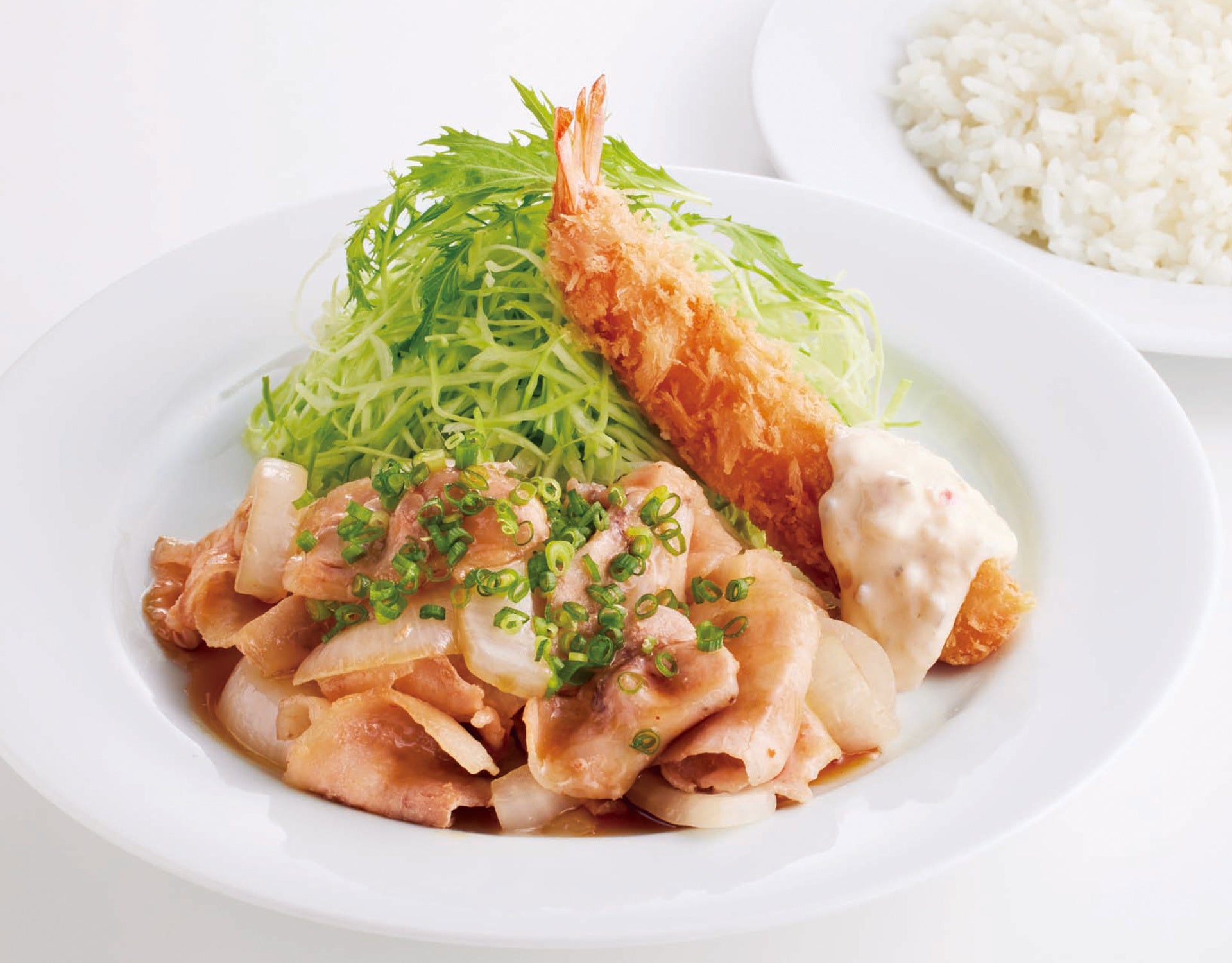 オリジナルの甘辛ダレで炒めた豚肉と人気のえびフライは、午後へのエネルギーチャージにピッタリです。