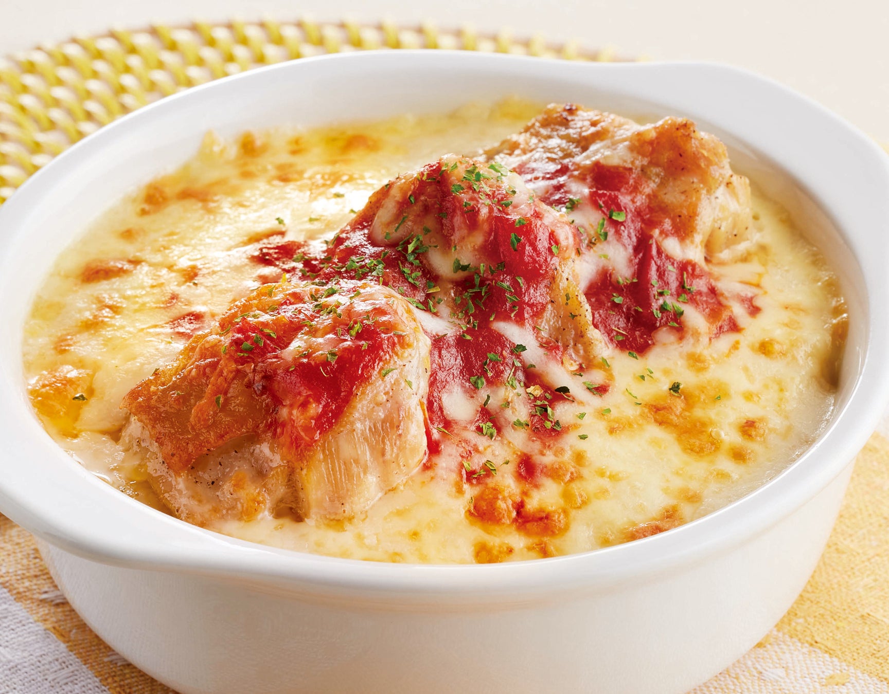 コク深いホワイトソース&特製トマトソースと濃厚チーズがチキンに絡むライトミールの人気メニュー。
